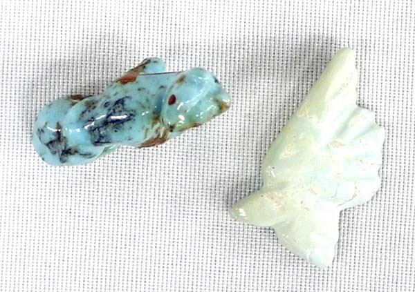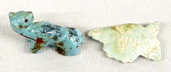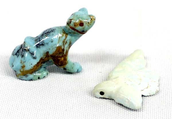 2 Native American Zuni Carved Turquoise Fetishes, largest measures 1'' x 1'', includes bird and mountain lion with coral eyes and heart line