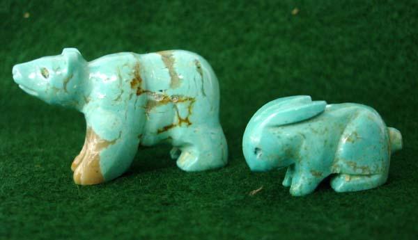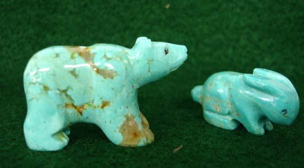 2 Native American Zuni Turquoise Fetishes, Bear & Rabbit, Rabbit has a Drill Hole, Bear measures 1.5'' x 1''. Buyers Pay Actual Shipping and Handling Charges(see terms and conditions for more information).