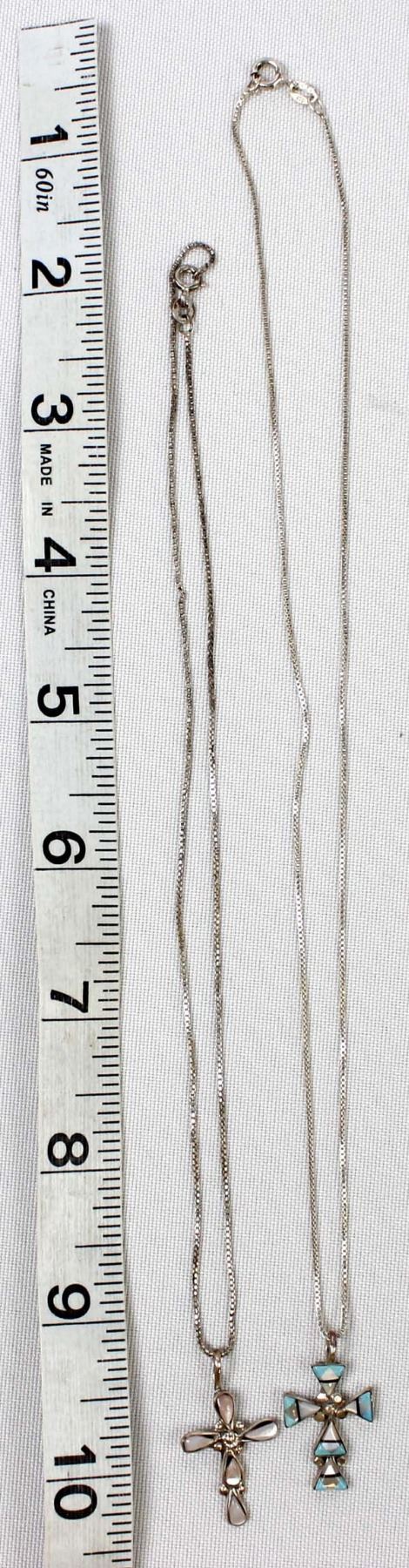 2 Native American Zuni Sterling Cross Pendant Necklaces, includes Pink Mother of Pearl Overlay Cross stamped sterling and Turquoise Mother of Pearl and Onyx Cross hallmarked, both are on sterling chains, largest pendant measures 1 1/8''L x 5/8''W, longest chain measures 18''L end to end