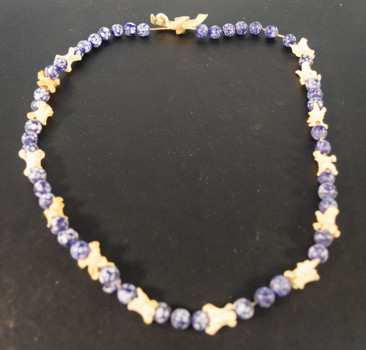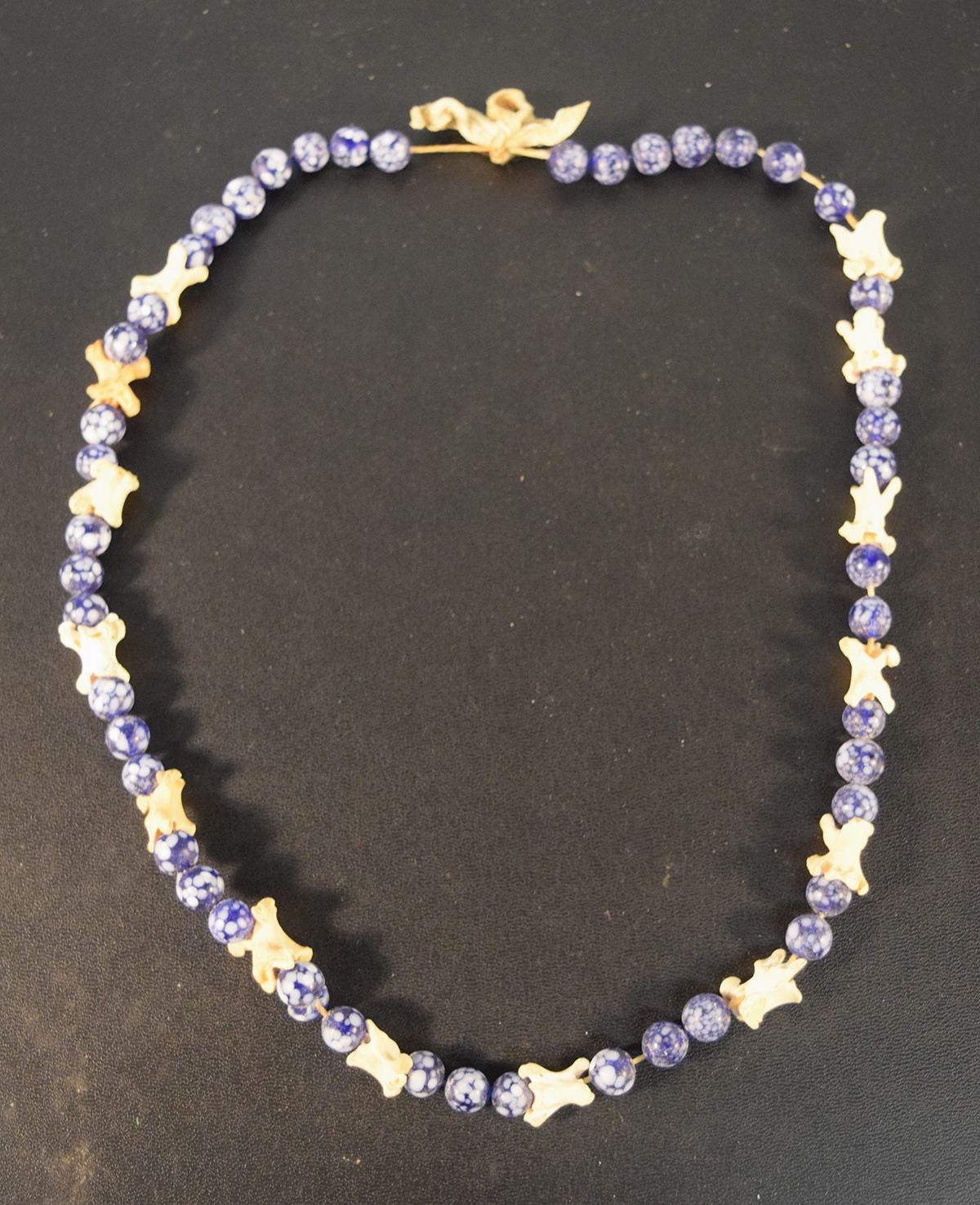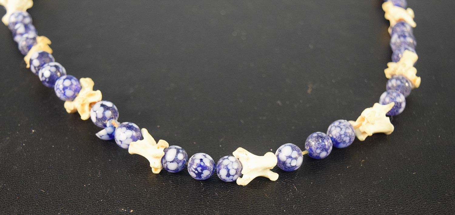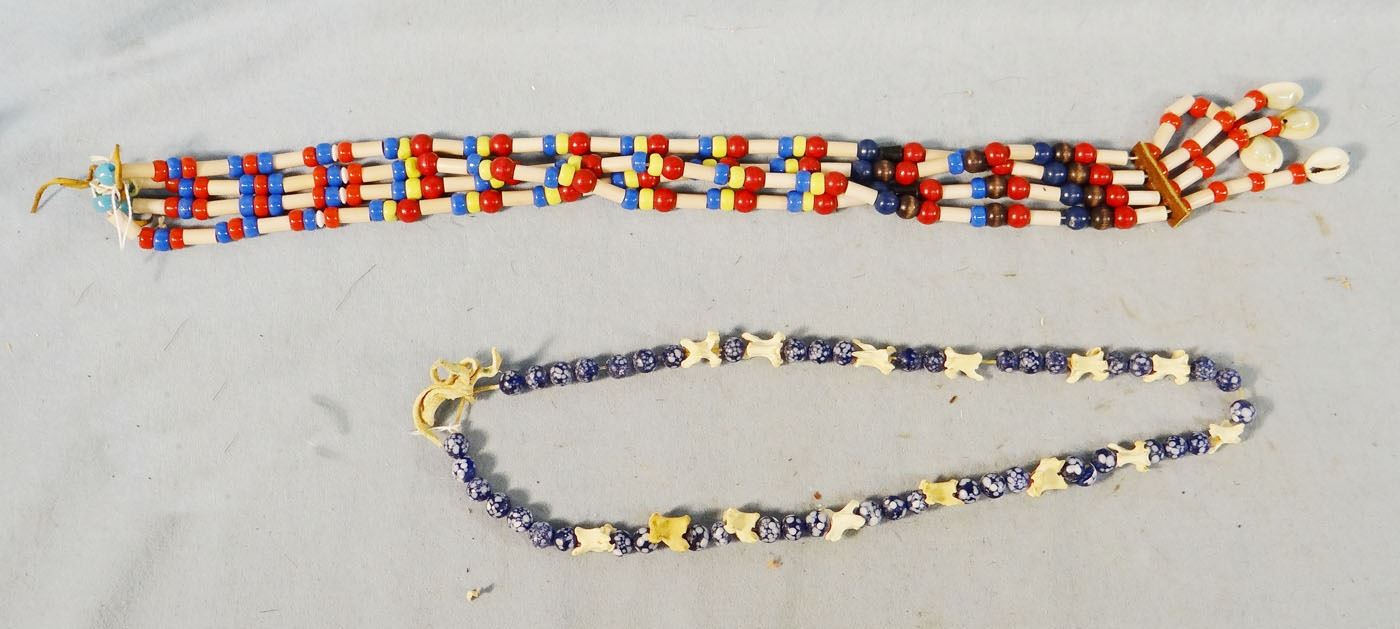 (2) Native American necklaces: Blue dappled trade bead necklace with small animal vertebrae, 13" & Large trade bead necklace, 21"
