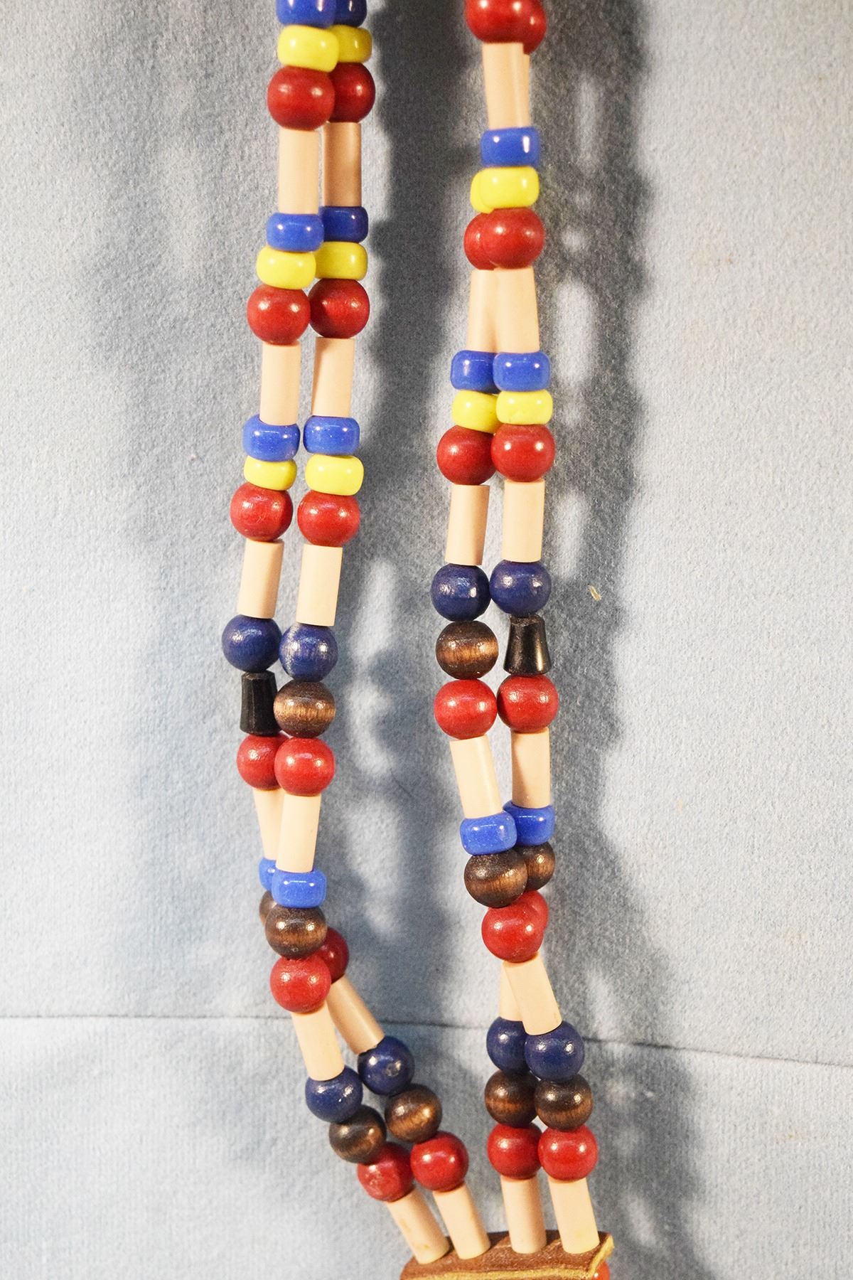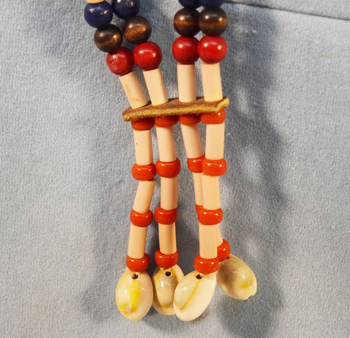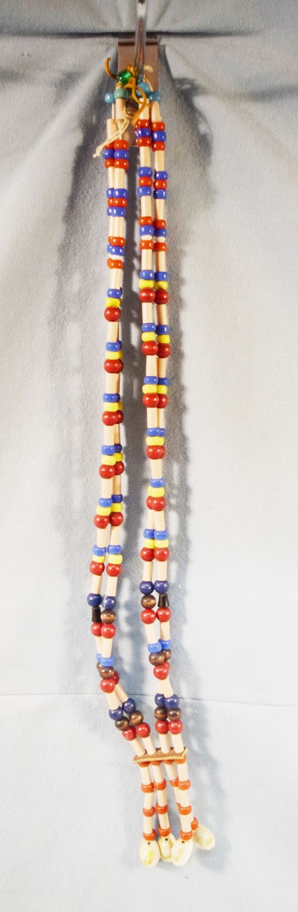 (2) Native American necklaces: Blue dappled trade bead necklace with small animal vertebrae, 13" & Large trade bead necklace, 21"