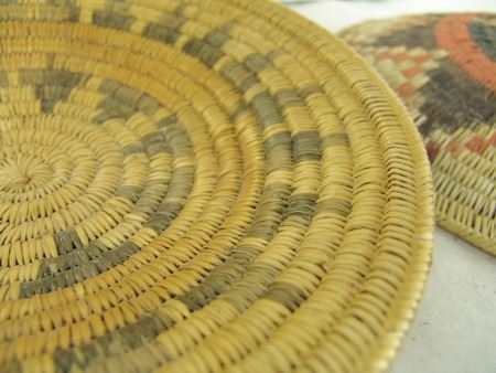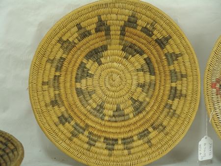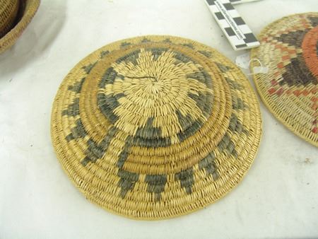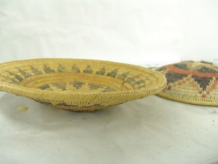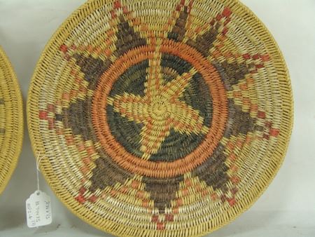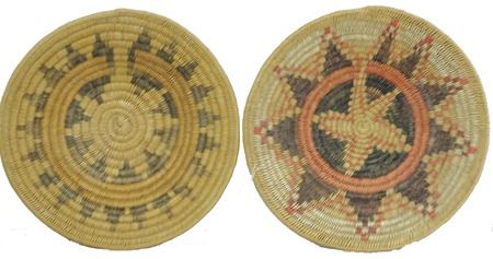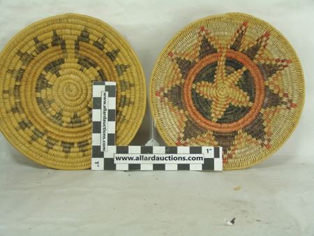 Mid/Late 1900s, Pair of classic Navajo wedding baskets, one with a more contemporary star design, the other a more traditional two-color motif. Both in very good condition, one slightly faded, and one with very minor stitch loss/damage. 3" x 12", 2-1/2" x 13"