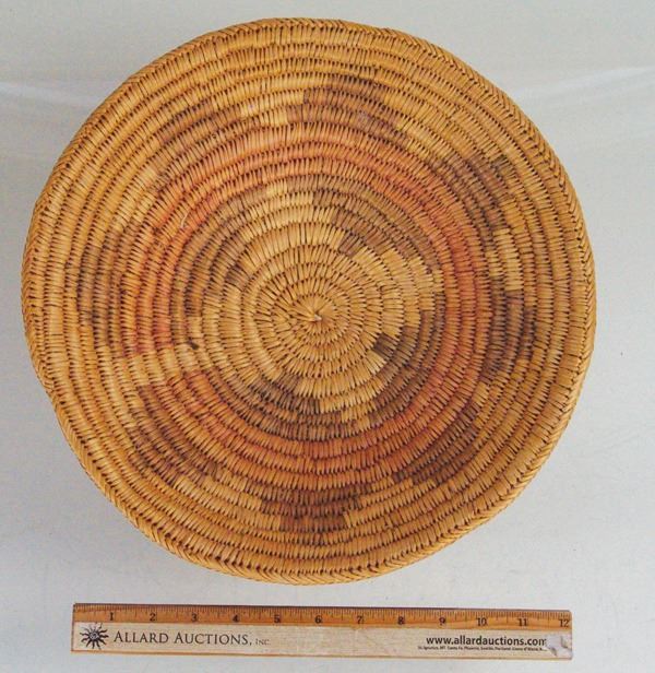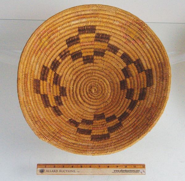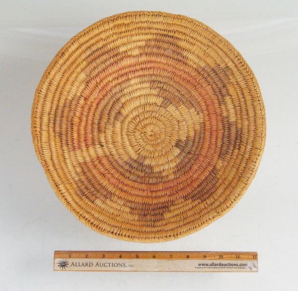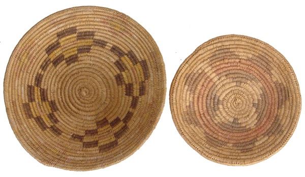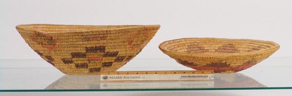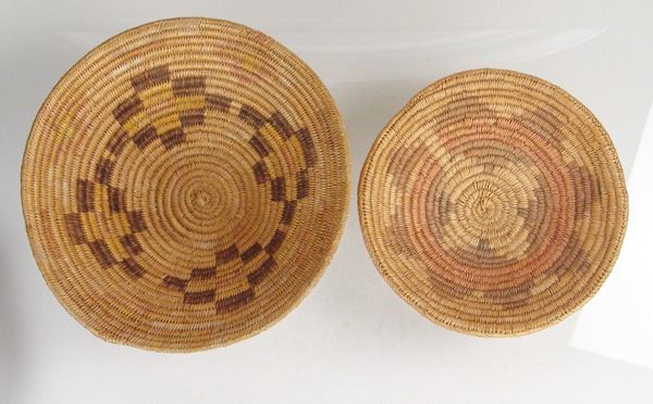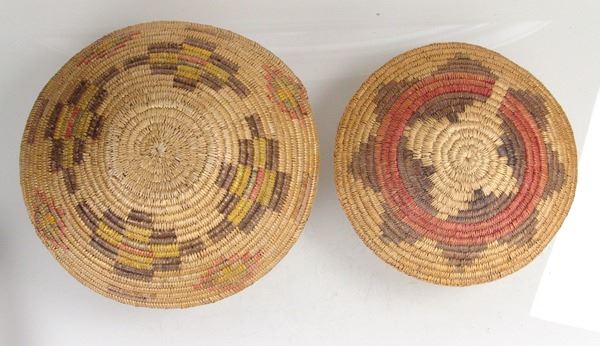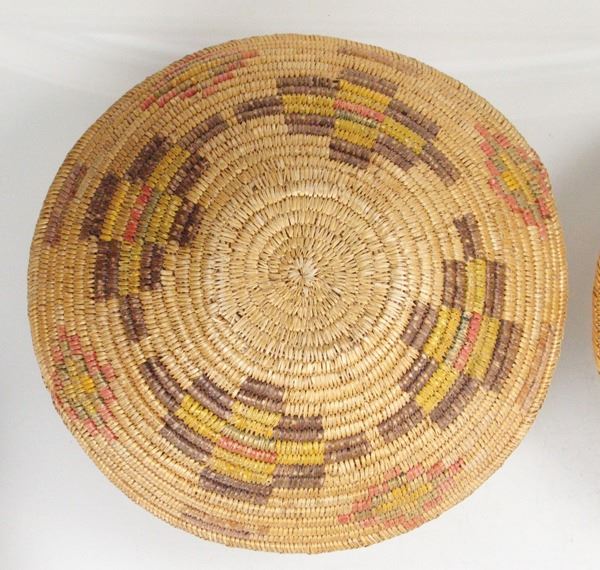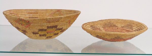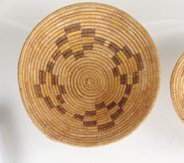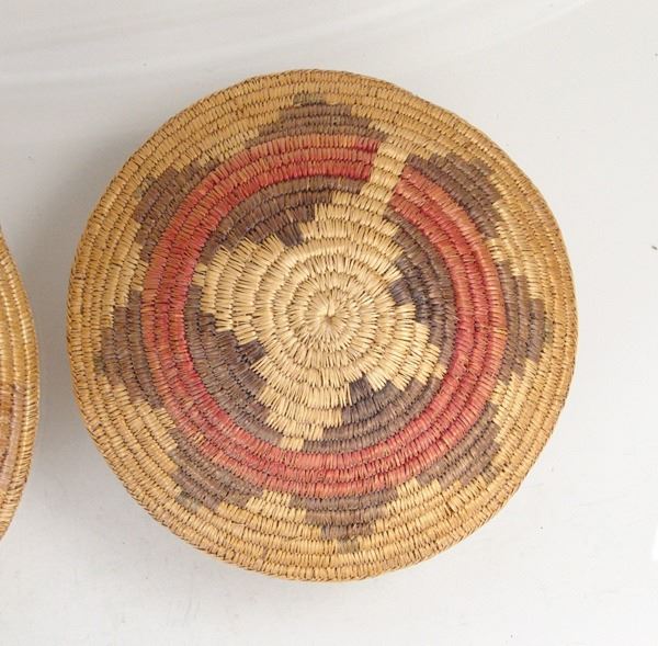 Vintage pair of classic hand woven polychrome baskets, a tray and a deeper tray/bowl. Very good condition, beautiful faded patina.Mid 1900s13", 16"