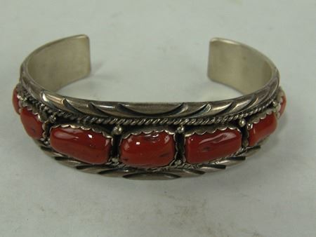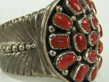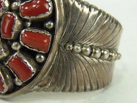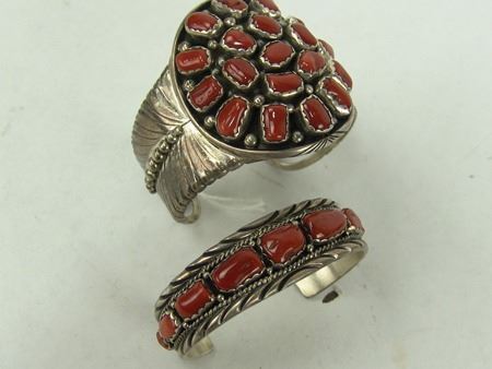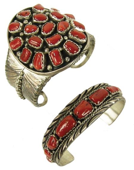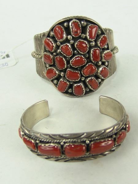 Ca. 1980s, Pair of beautiful all-silver bracelets with great stamped details and both loaded with hand cut oxblood red coral stones in unique Calavaza-style scalloped bevels. Both in excellent condition.