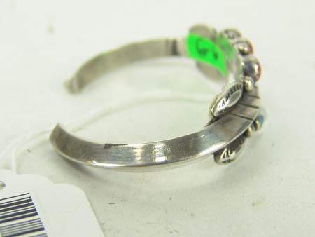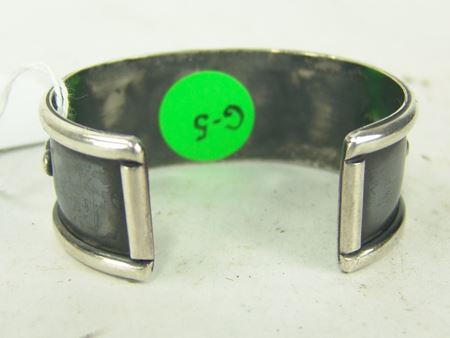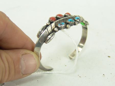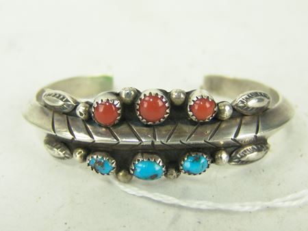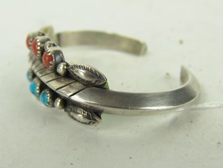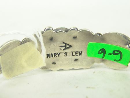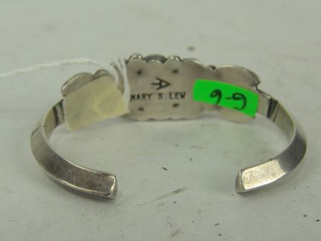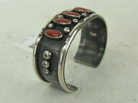 Ca. 1970s-1980s, Two all-silver bracelets, one unsigned with oxblood red coral stones, the other sandcast and signed "Mary S. Len," who worked for Atkinsons. Both in very good condition. Larger 5-1/2" + 1-1/8" x 1"