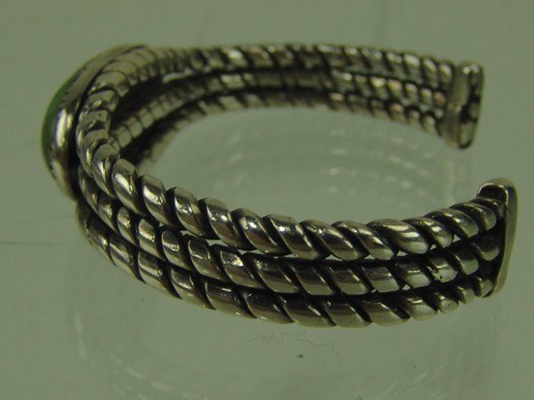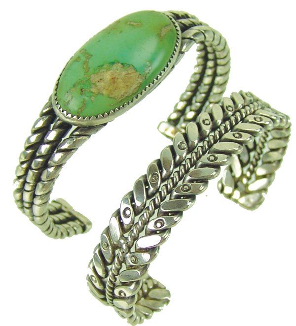 Late 1900s Largest 5-1/4" x 1-1/2" Quality pair of heavier gauge, hand wrought all silver bracelets done in a flattened, rope work style, one with a green, oval, turquoise stone. Very good condition, unsigned.