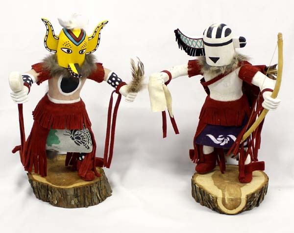 2 Native American Navajo Kachinas by Andy Sharon, largest measures 12.5'' x 9'', includes ''Fox Kachina'' and ''Zuni Rain Priest'', embellished with rabbit fur, feathers, and leather, both are signed