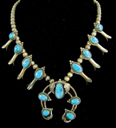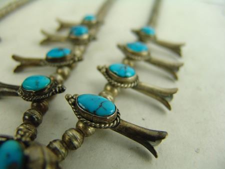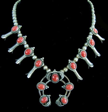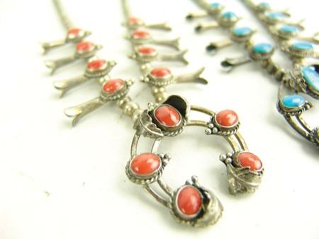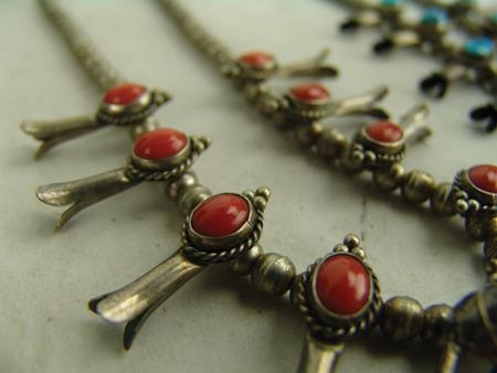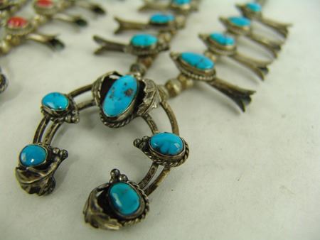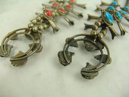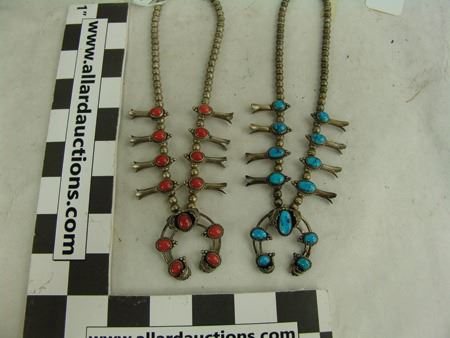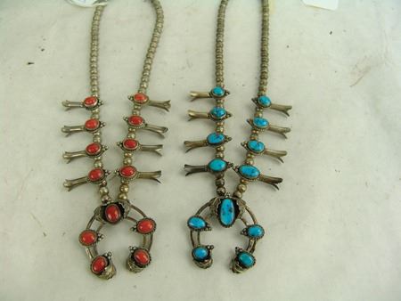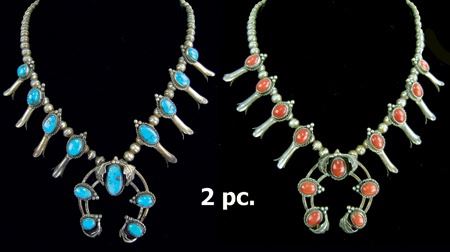 Ca. 1970s, Pair of matching petite-sized all-silver baby squash blossom necklaces, one with turquoise, the other with coral, both by the same maker. Very good condition. 16', naja 1-1/2" x 1-3/4"