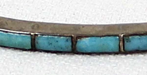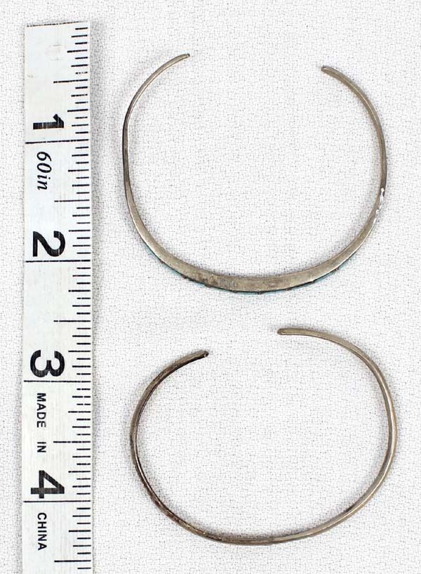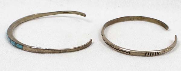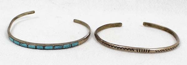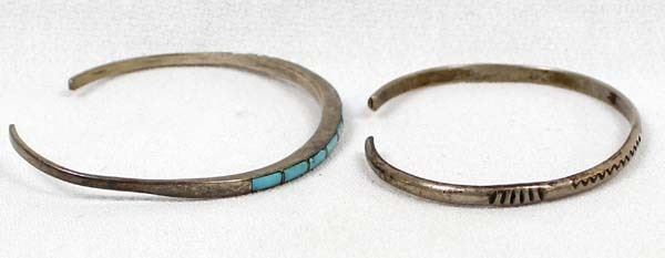 2 Native American Navajo Old Pawn Sterling Silver Bracelets, includes one with turquoise, inside measures 6'' which includes the gap x 1/8''W, one bracelet has hand stamped details