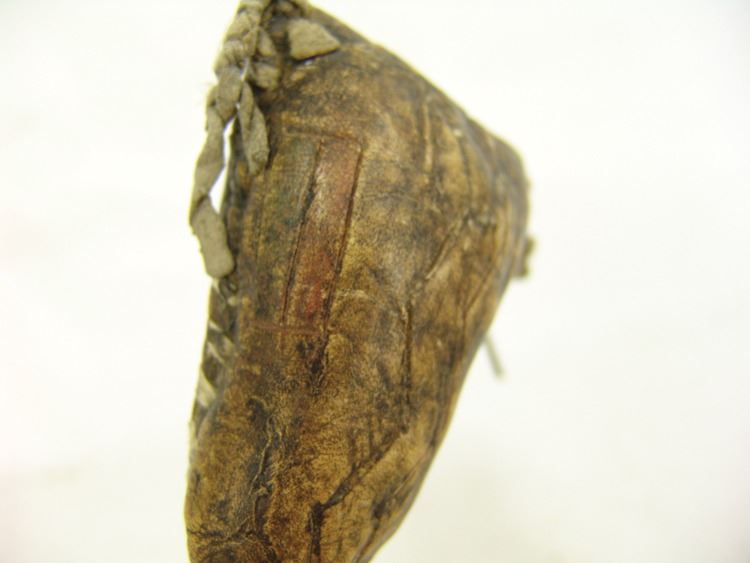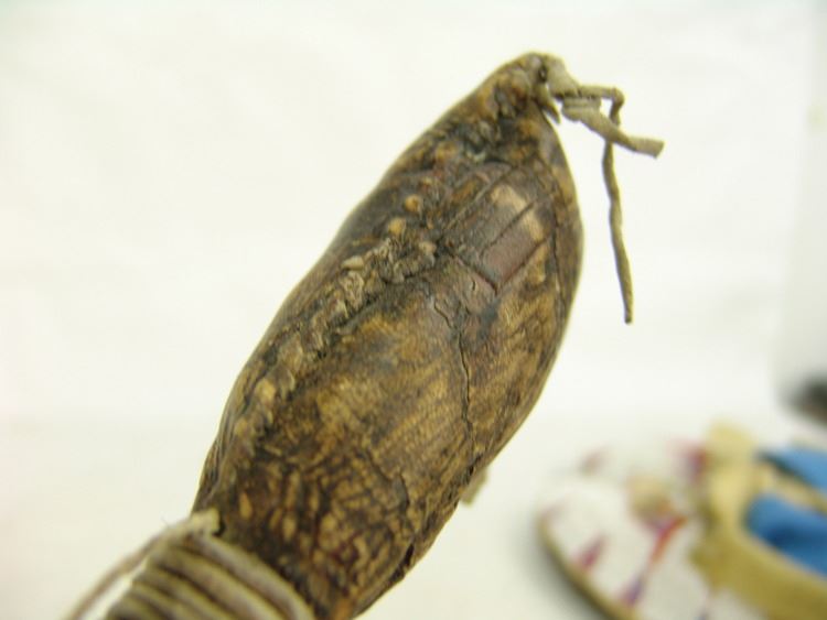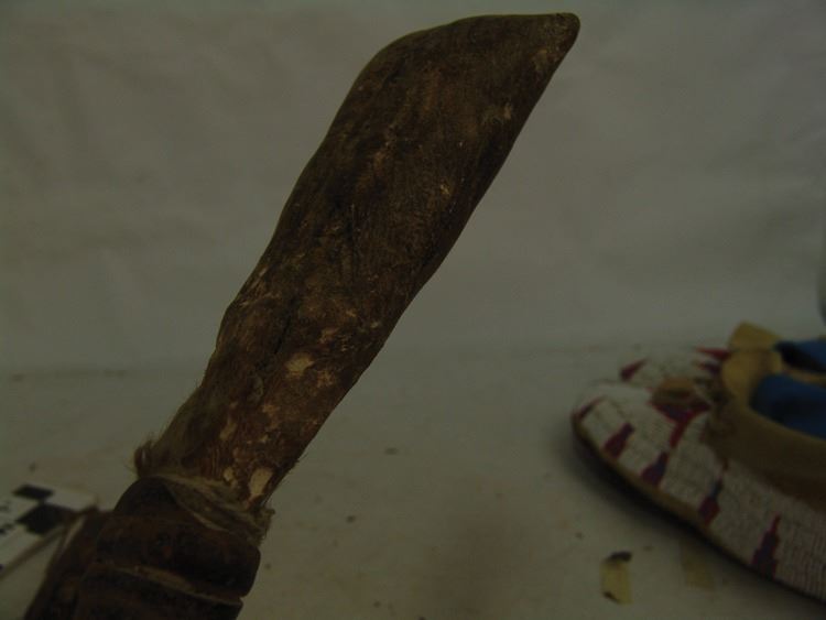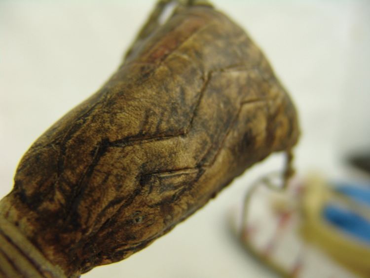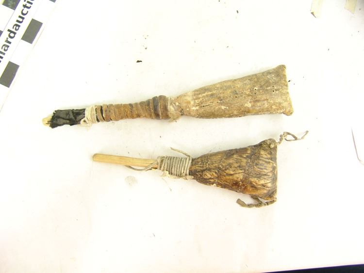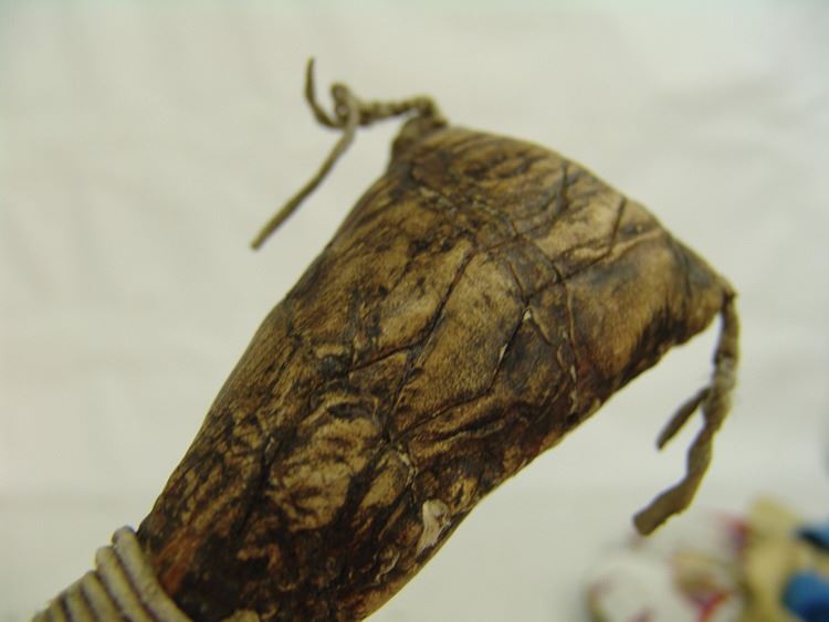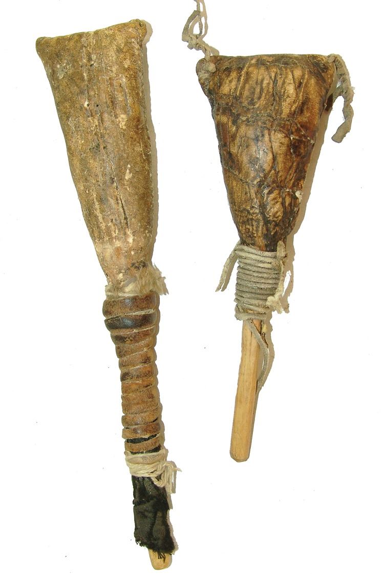 Pair of rare old shaped rawhide ceremonial rattles the smaller with incised and colored decorations, both with leather wrapped wooden handles. Good condition. This is an early pair.,Early 1900s,9-1/2", 7" (beaded)