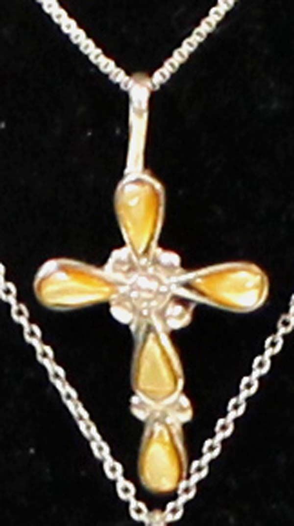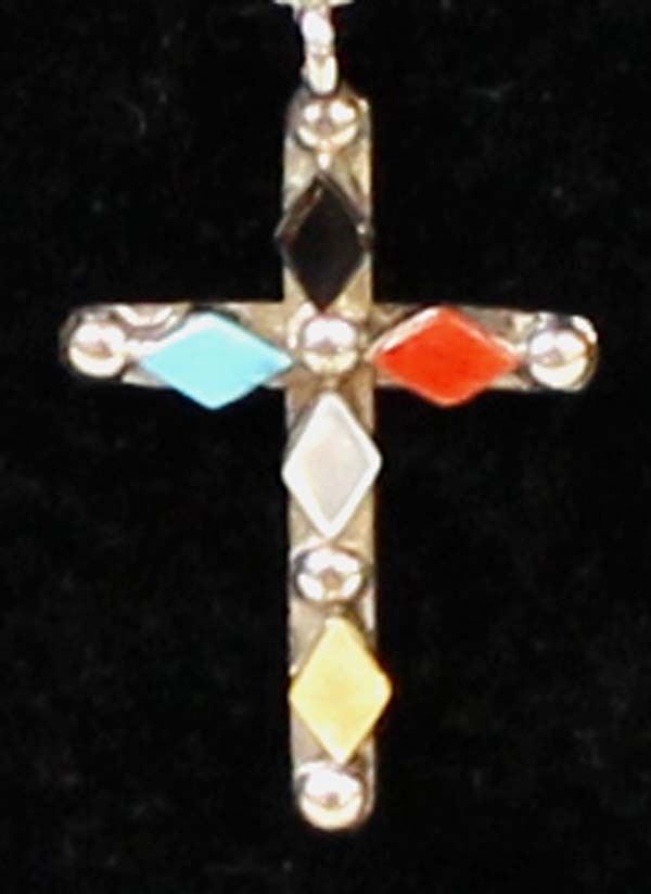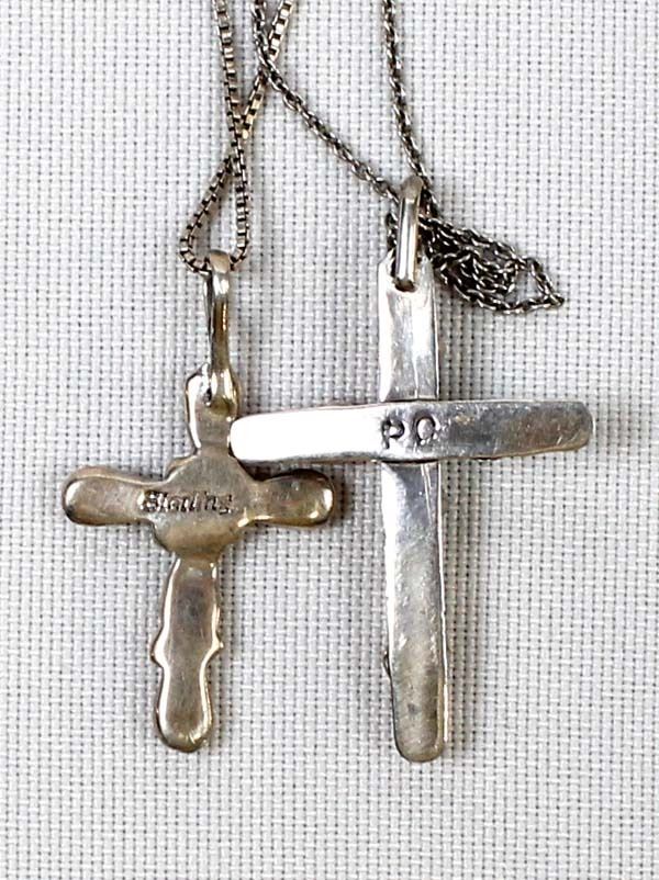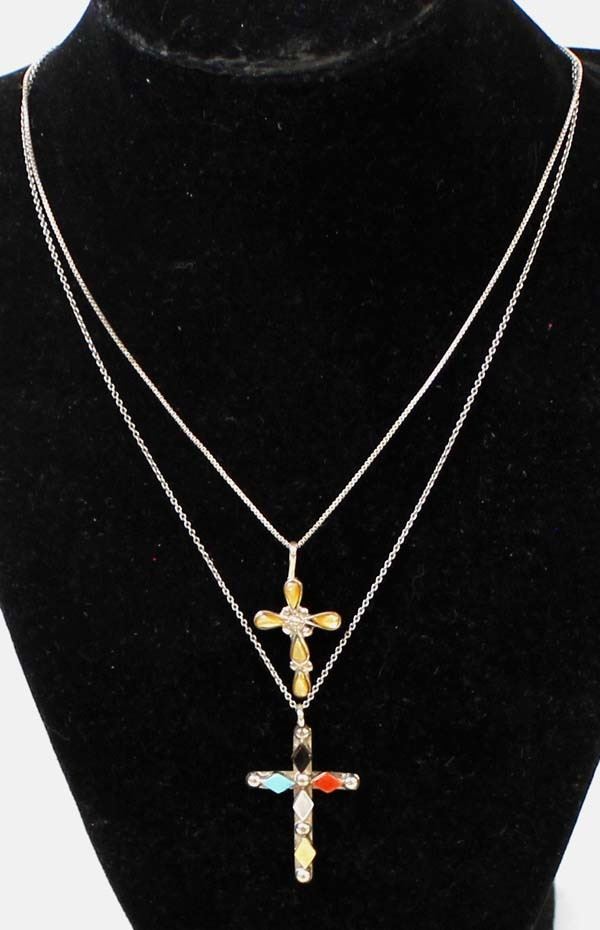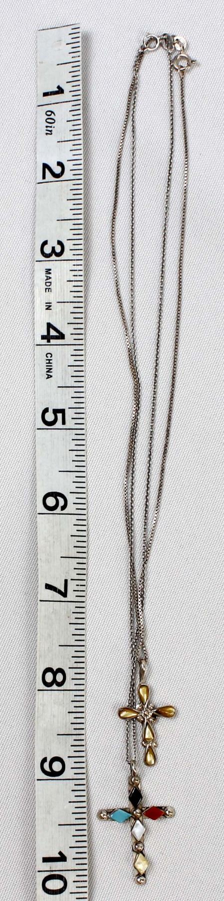2 Native American Navajo Sterling Cross Pendant Necklaces, includes gold lip shell cross pendant and multi-stone cross pendant, both chains are sterling silver and are marked, the gold lip shell cross is stamped sterling, the multi-stone cross is hallmarked PC (possible artists P. Chee or Della & Presley Curley), largest cross pendant measures .5'' x 1.25'', longest chain measures 18''L end to end