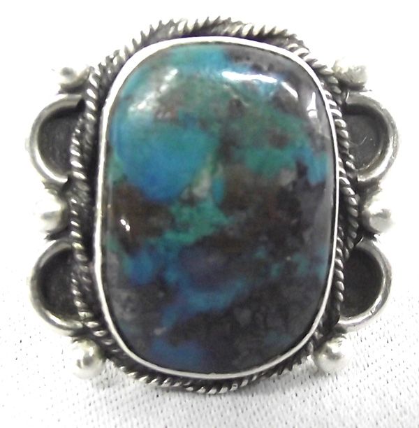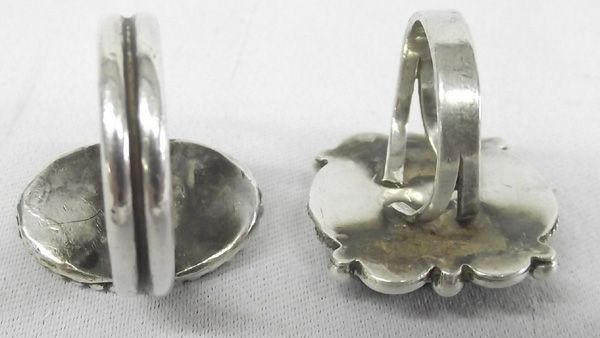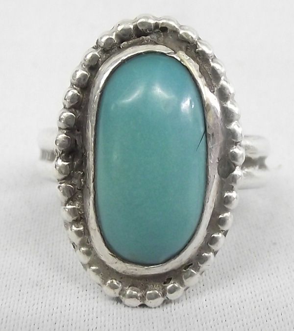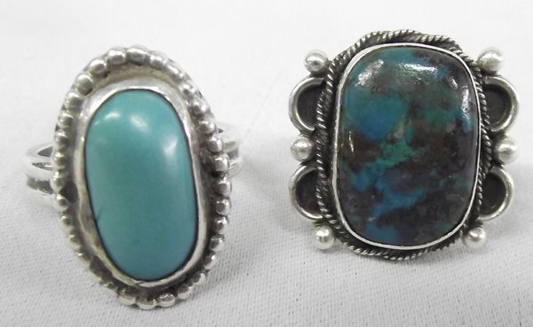 2 Navajo Sterling Silver Turquoise Rings. Both rings are traditional and unsigned. The ring with the light turquoise cabochon in a silver bead setting is size 10. the other ring with the silver rope braid around the turquoise cab is a size 7.5.