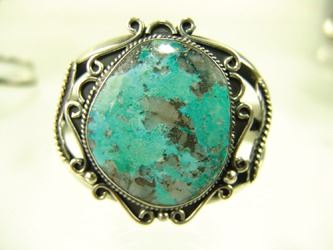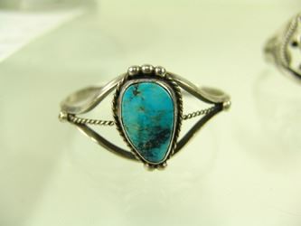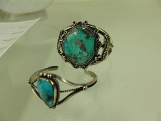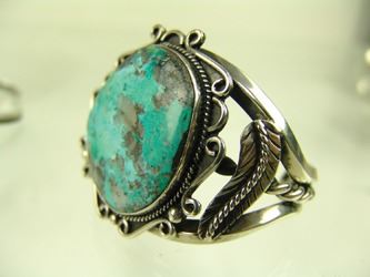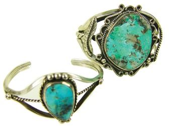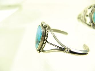 Pair of traditional, all silver cuff bracelets with similar, Pilot Mountain turquoise stones, the larger with elaborate leaf, scroll, and rope work accents the other, a daintier version, with fine, roped accents. Very good condition. Ca. 1980s. 5" + 1-1/2" gap x 2" wide, 4-3/4" + 1-1/4" gap x 1-1/4" wide.