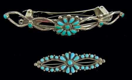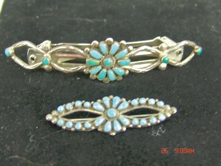 Ca. 1960 & 1980, Both made from turquoise and silver, the smaller older one done in petit point style, the larger with a single cluster and stamped details. Very good condition. Largest 4"