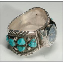 the first formed as a flat cuff and decorated with inlaid crushed stone, the second as a flaring cuff set with 12 irregular turquoise nuggets in a heavily filed and hammered mount, the latter with a Timex watch