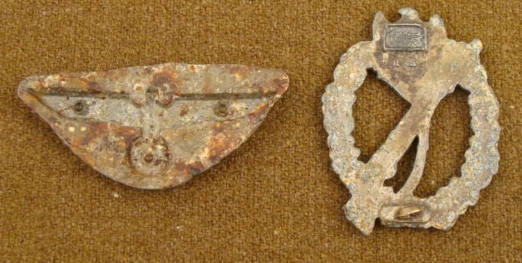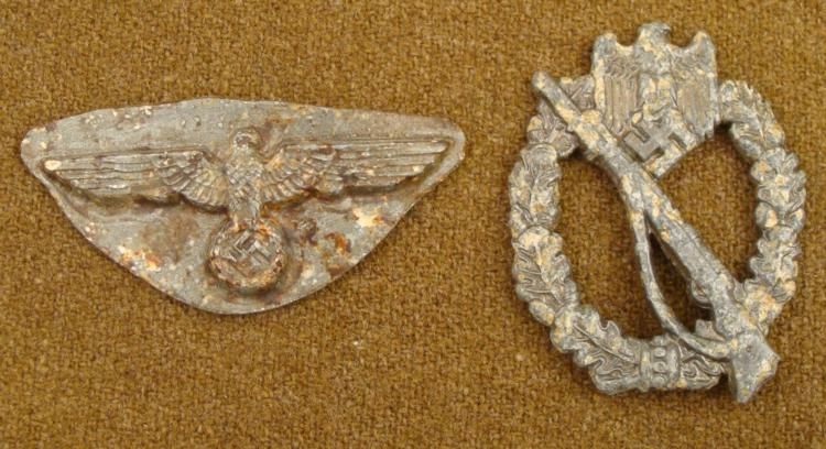 Here are two reproduction Nazi badges. One has an Eagle and Swastika, and the other a rifle with oak leaves. Their condition is very good, with authentic looking aging. They have no pins. They are 2-2 1/2" wide.