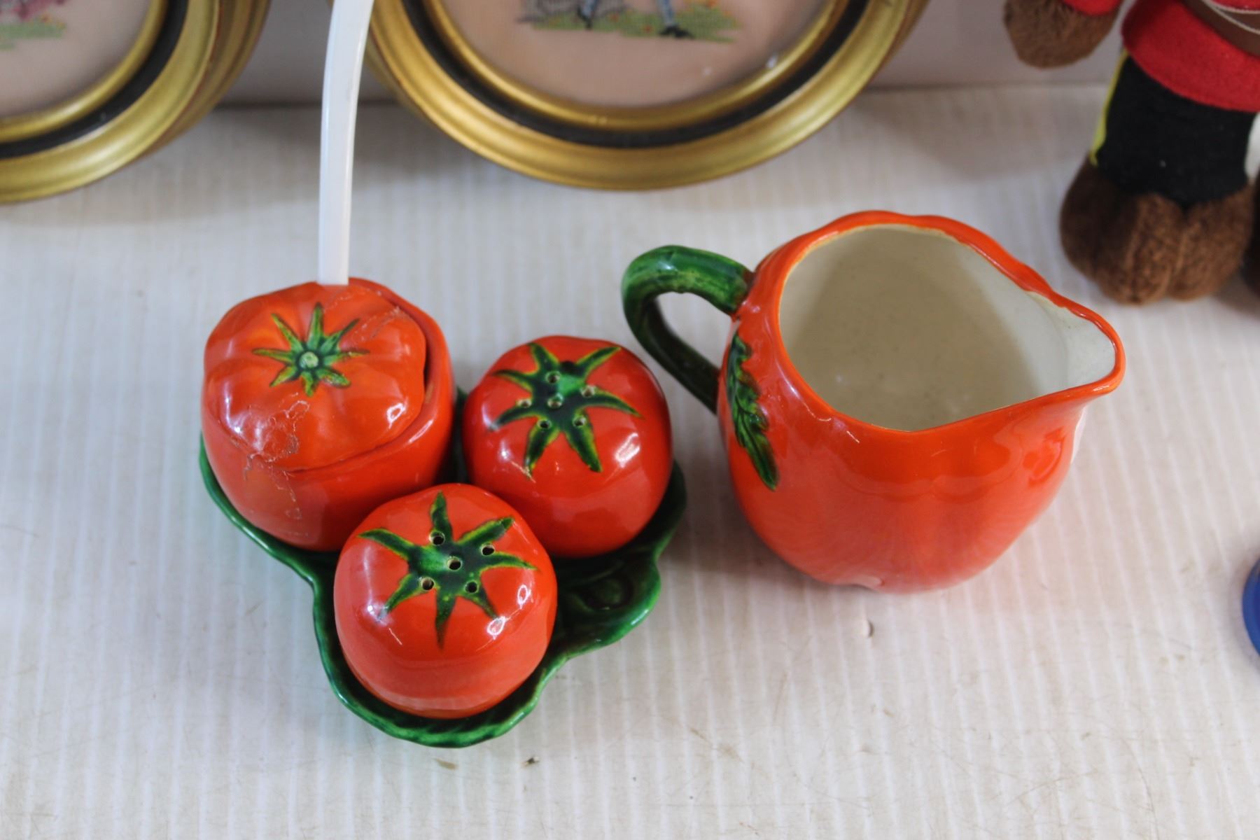 (2) Needle Point Framed Arts, Tomato Cream & Sugar and Salt & Pepper Shakers Set, Bottle Opener and RCMP Moose Plush