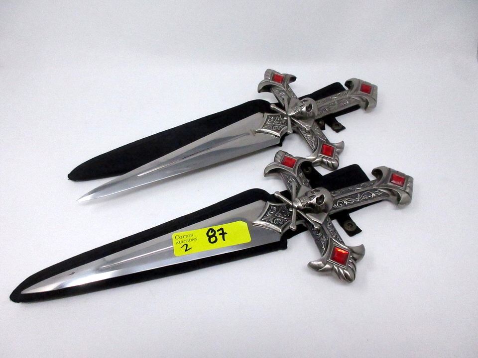 Stainless steel. 6 inch wide Hilts. Canvas sheaths included.