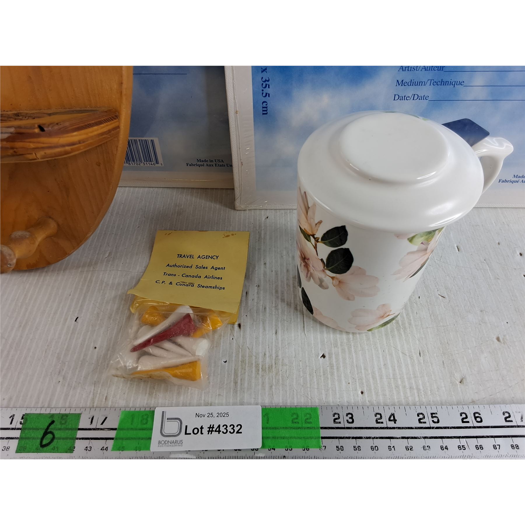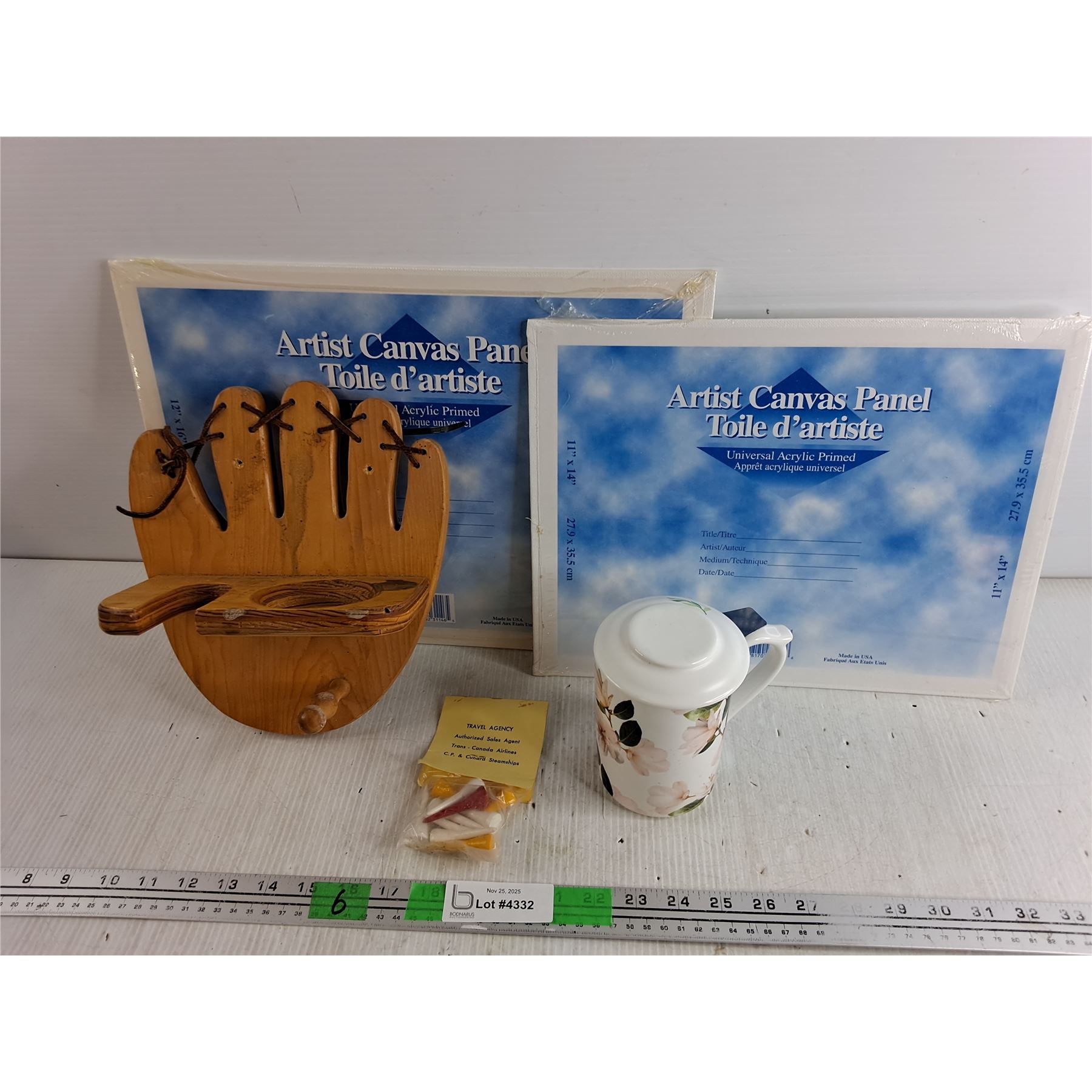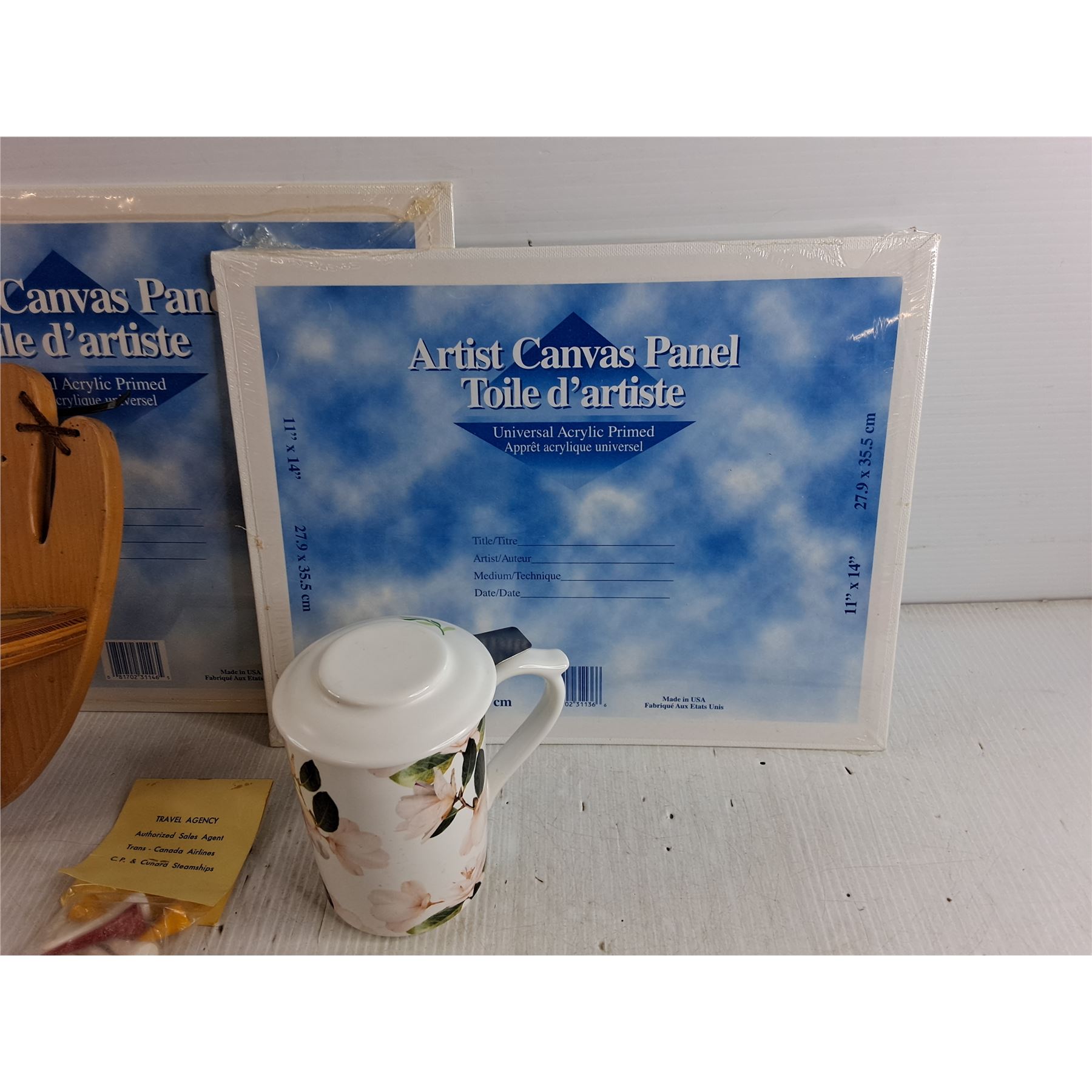 2-New Canvas Panels, Indigo Ceramic Mug- Strainer with Lid, Wooden Baseball Bat and Ball Rack, Tees