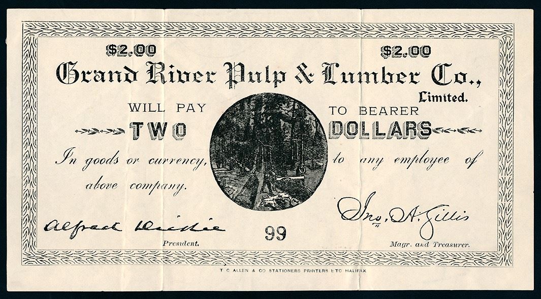 $2 Newfoundland Merchant Scrip, 1899 "Grand River Pulp & Lumber Co", VF-EF