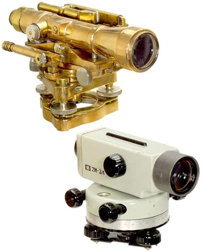 2 Nivelliergeräte 1) Russisches Nivelliergerät. Einfaches, aber sehr genaues Instrument. Justage über Libellen, Horizontalskala, 3 Fußschrauben zur Feinregulierung. – Und: 2) Nivellier "Cooke, Troughton & Simms", dekoratives Nivellier aus Messing, 29 cm lang mit Koinzidenzlibelle. Vertikal mit Mikrometerjustierschraube, 3-Fuß-Lagerung. Der Azimut-Teilkreis muß gereinigt werden. 2 levelling instruments – (3+/–) – € 200/300 – (306/10)