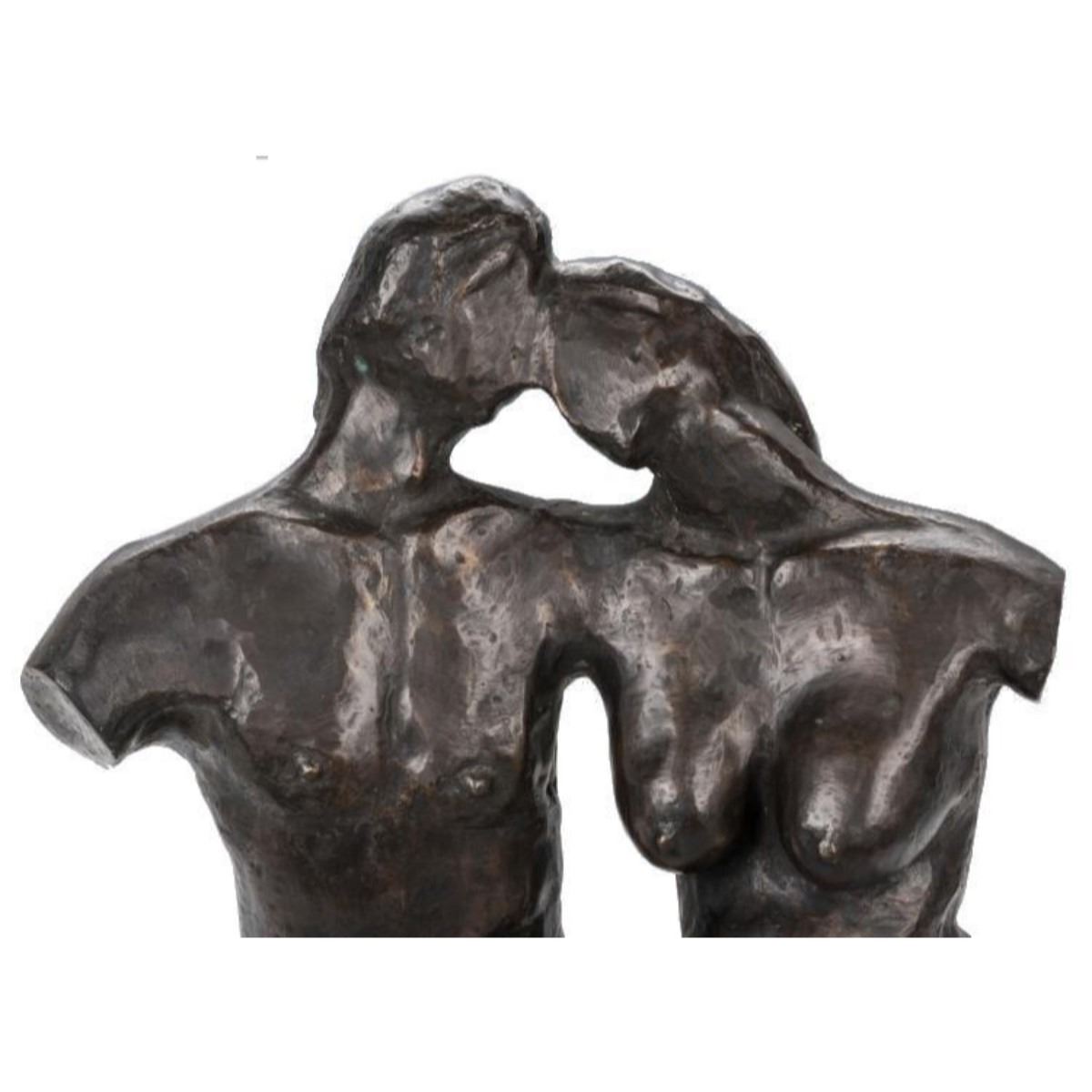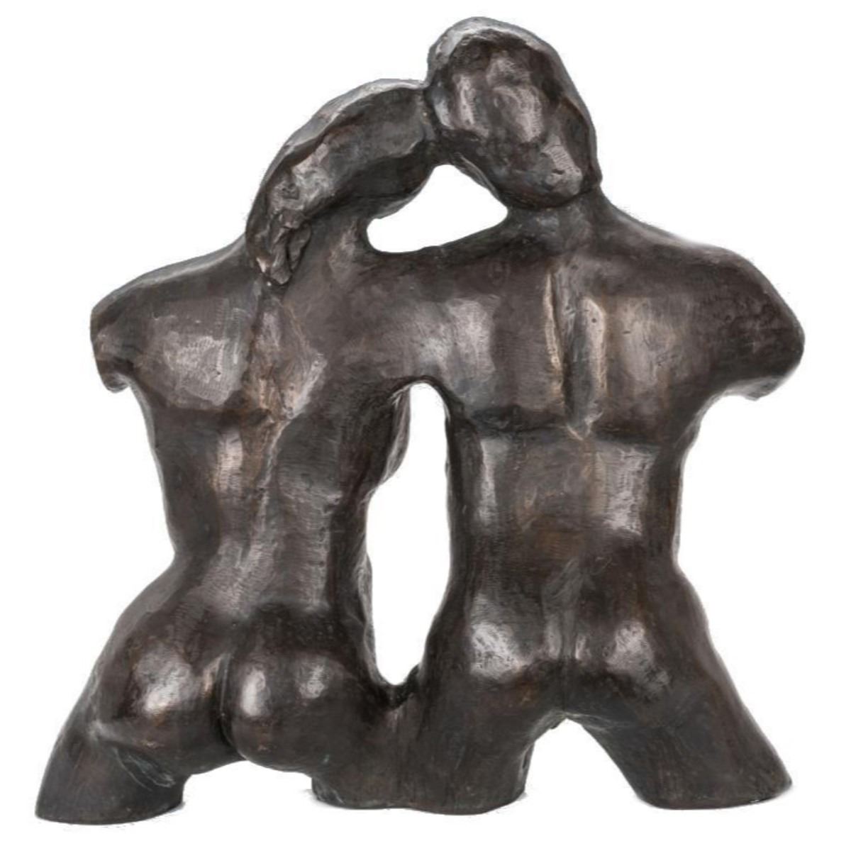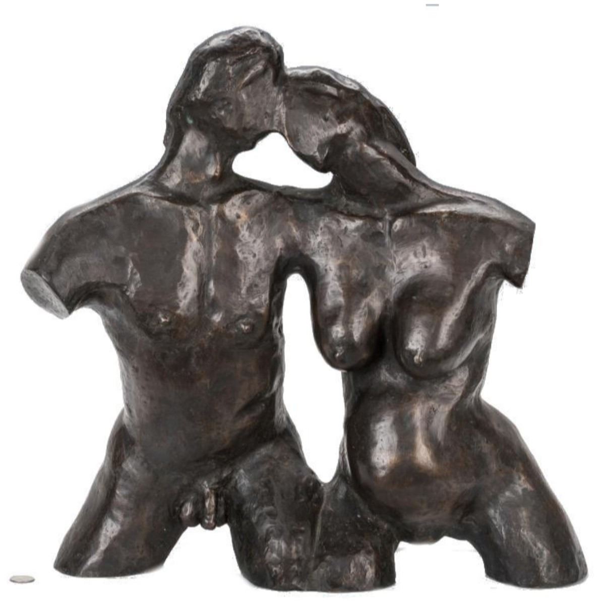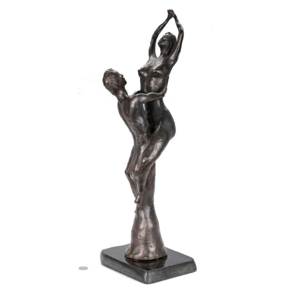 Two (2) nude bronze sculptures by Arthur Umlauf (Georgia, b. 1947). 1st item: Bronze nude sculpture depicting two lovers in an embrace with the woman leaning her head upon the man's shoulder. Unsigned. 21 1/4" H x 21" W x 7 1/2" D. 2nd item: Bronze nude depicting two lovers in an intimate embrace. Signed "A. Umlauf" on base. Mounted onto a naturalistic black marble base. Bronze - 25" H. With base - 26" H. Both 20th century. - 9129-012718-IN-00597