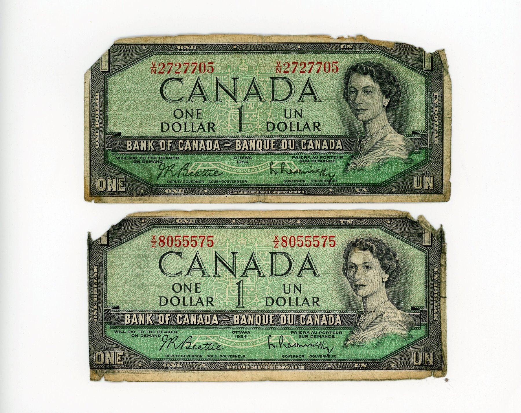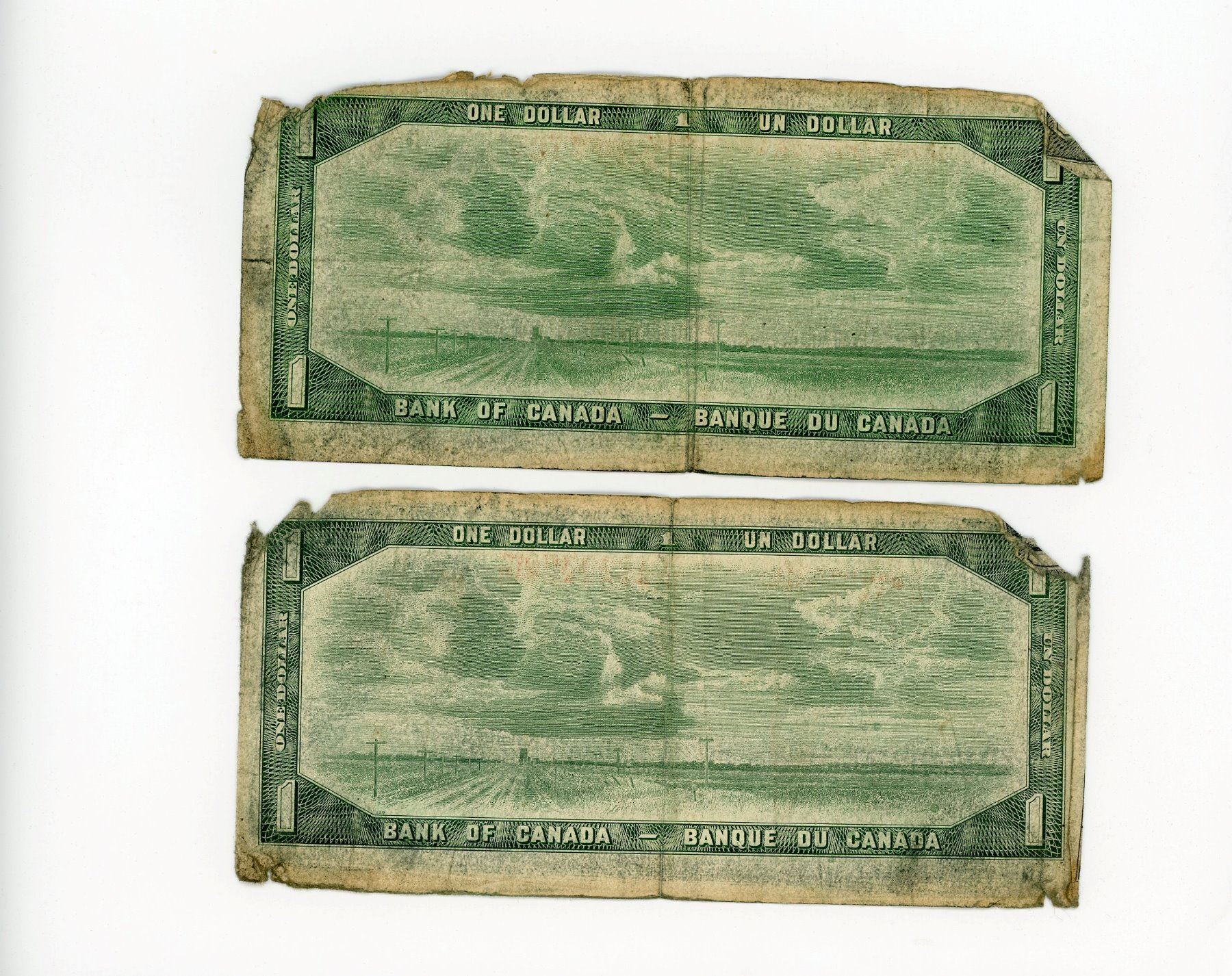 2-ONE DOLLAR BILLS (CANADA) *1954*