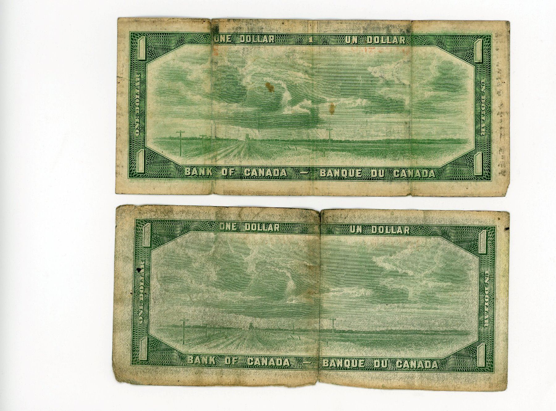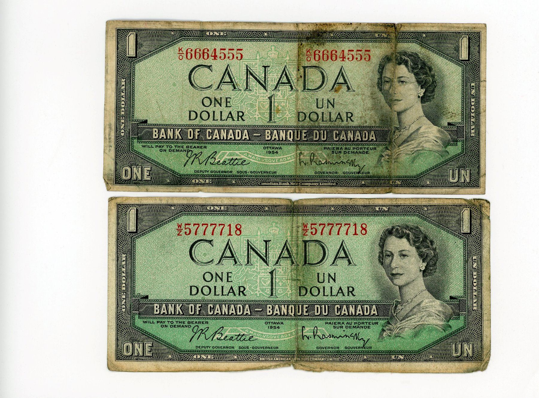 2-ONE DOLLAR BILLS (CANADA) *1954*