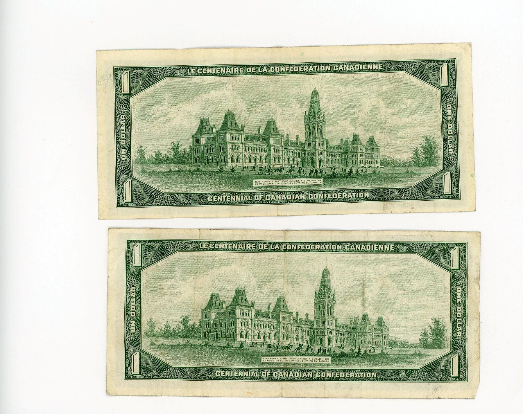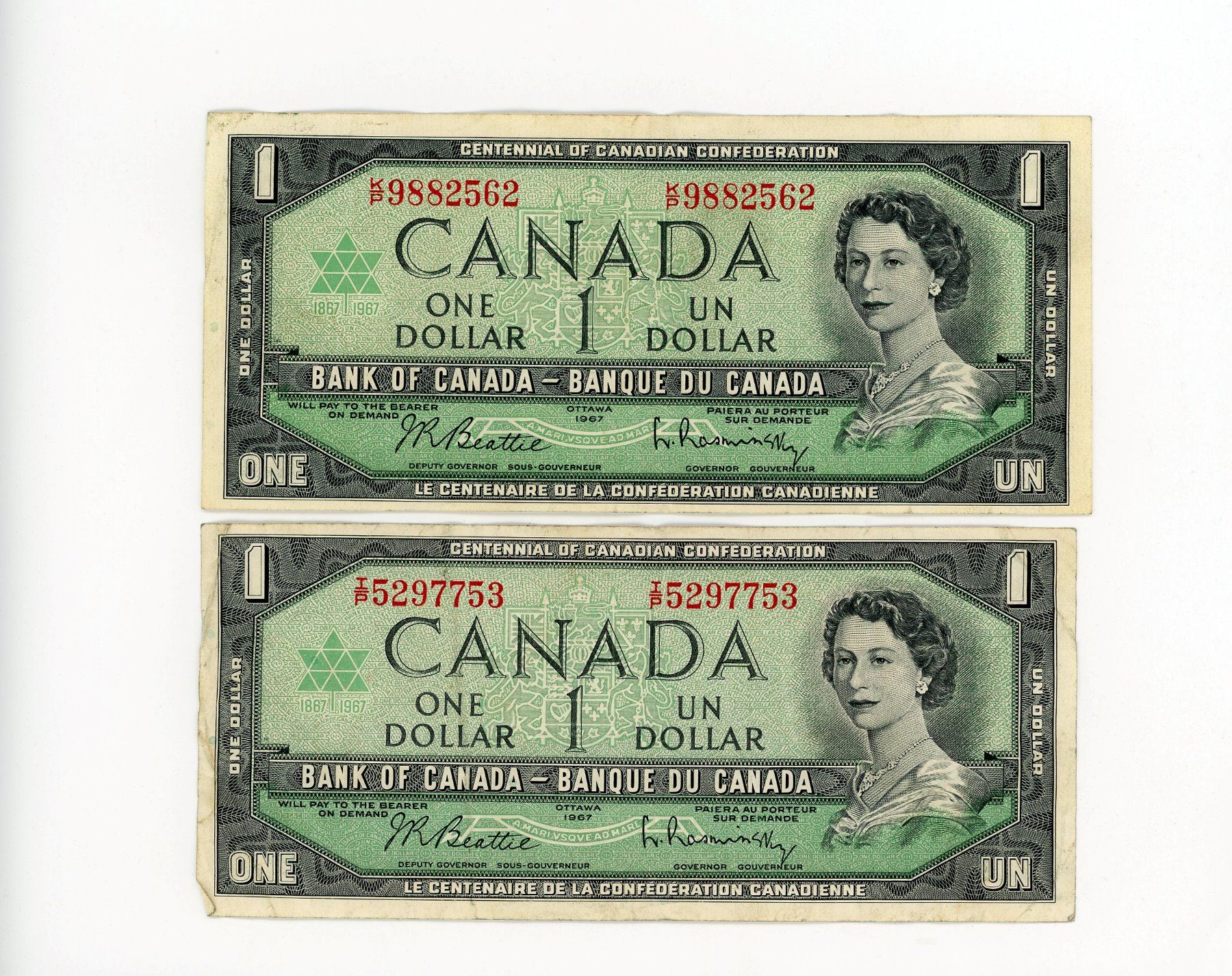 2-ONE DOLLAR BILLS (CANADA) *1967*