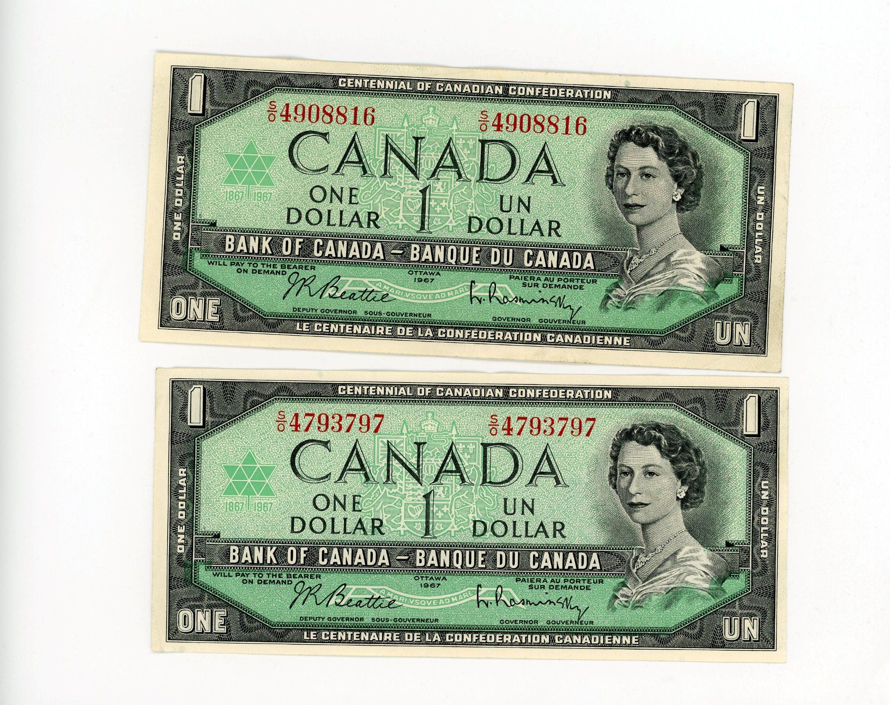 2-ONE DOLLAR BILLS (CANADA) *1967*