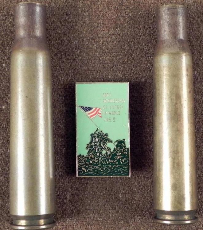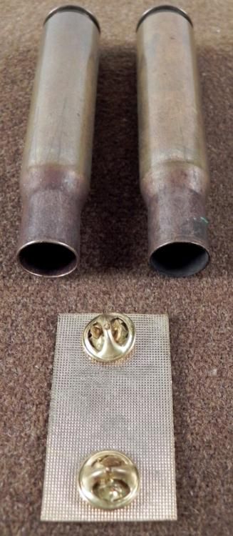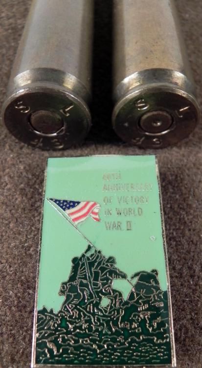HERE ARE TWO 1943 BRASS ARTILLERY SHELLS &A "40TH ANNIVERSARY OF"VICTORY IN WWII" ENAMEL BADGE. THE SHELLS ARE 4" TALL AND BADGE IS 1 X"1 3/4" WITH A CRIMP BACK.