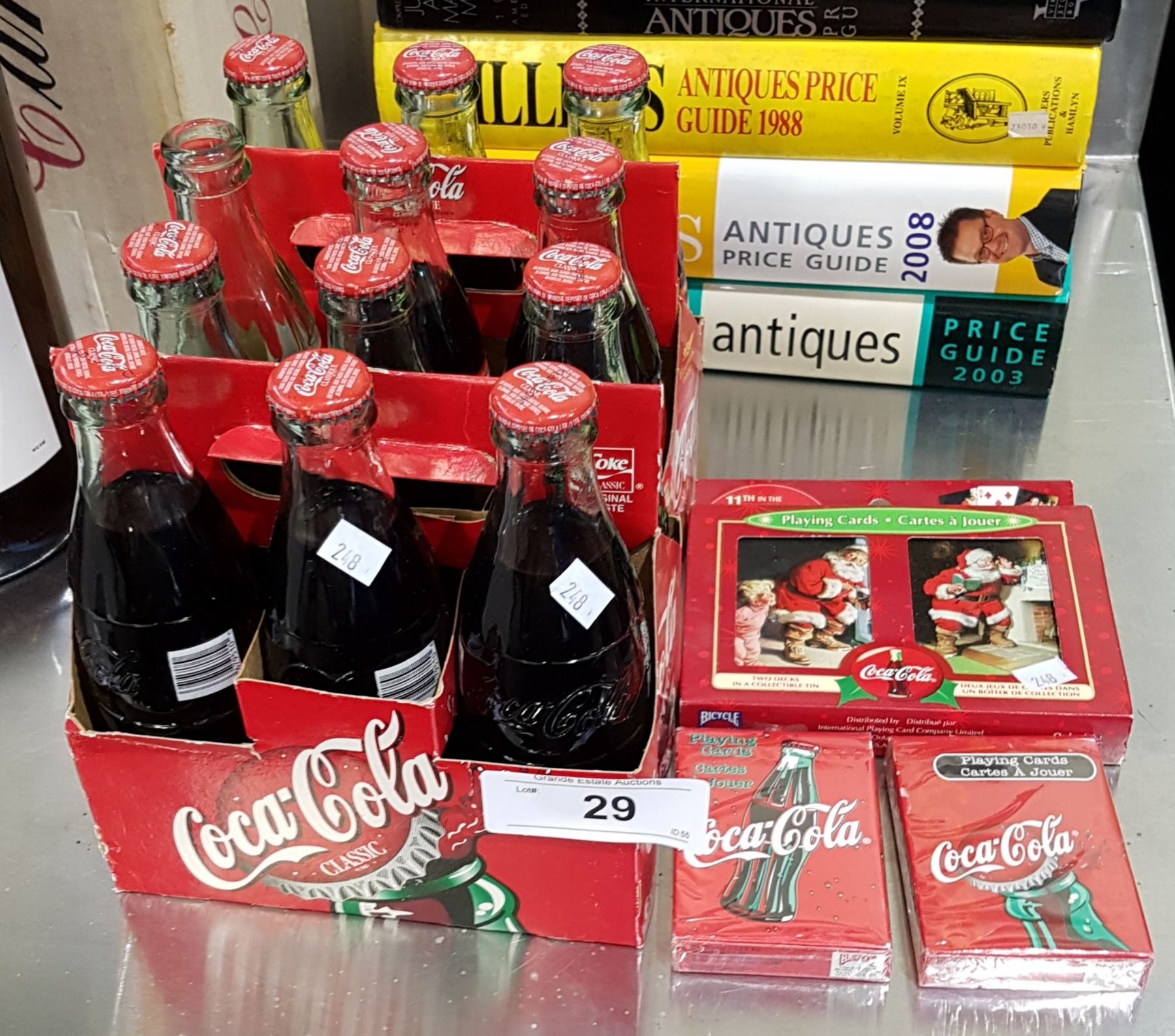2 ORIGINAL COCA-COLA CARDBOARD BOTTLE CARRIERS W/BOTTLES & 4 NEW PACKS OF PLAYING CARDS