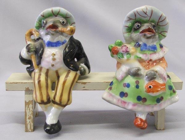 2 Occupied Japan Porcelain Frogs On A Bench. Wood bench. Largest frog measures approx. 4'' x 2'', bench and frogs measures approx. 4.5'' x 6.5'' x 2.75''. SHI $20.