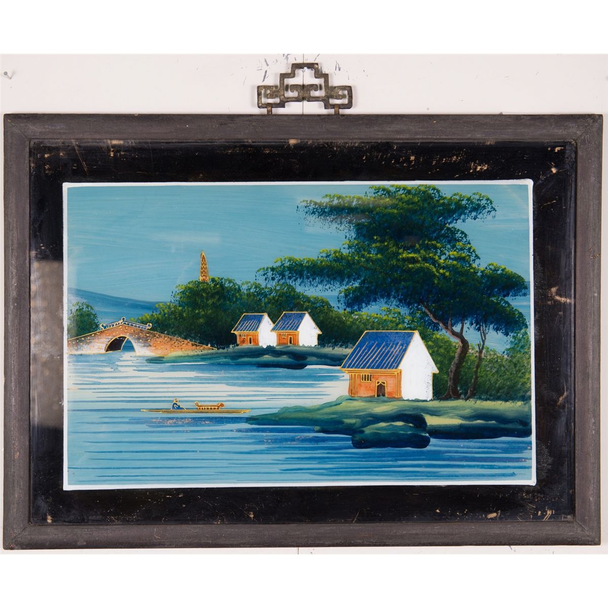 Two oil on board paintings with Chinese wooden frames and metal picture hangers; 52 cm x 41 cm, 52 cm x 38 cm