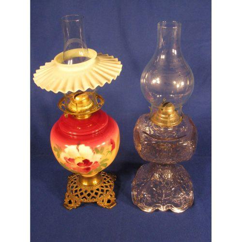 2 Oil lamps, one handpainted with opalescent shade, 21"