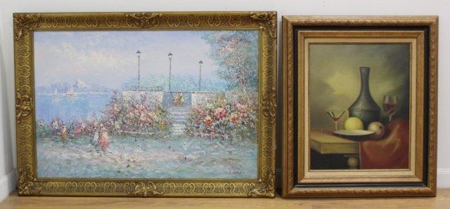 One lakeside landscape with figures, signed Bonnat lower right, approx. 24" H x 36" W sight, 30" H x 42" W framed; and still life, signed Bullas lower right, approx. 20" H x 16" W sight, 28 1/2" H x 24 1/2" W framed.