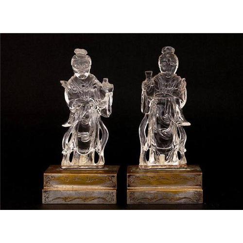 <table width="100%" border="0" cellspacing="0" cellpadding="4"><tr><td><em> </em></td></tr><tr> <td width="100%"> Pair of Old (1920s) Chinese Crystal Carved Lady Hold