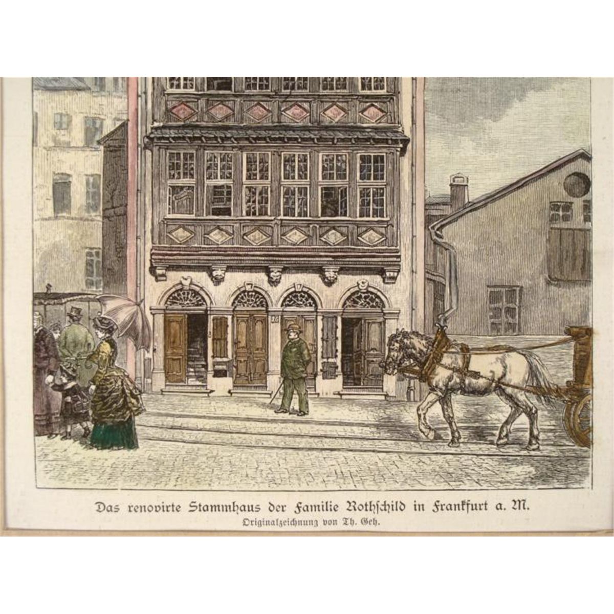 These two old prints are from the German family Rothschild. One is a portrait of Baron Adolphe De Rothschild originally done in 1844. The sheet size is 8 x 11 inches. The other shows the Rothschild family house in Frankfurt. The image size is 5 1/4 x 7 inches, set in a 13 3/4 x 10 inch atte. Both are in very good condition. * It is special to find two historical prints from such a prominent 19th century family.