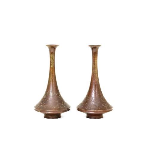 They are in good condition with no repairs, chips, or cracks, except minor rubbing of patina at the neck, small pitings at the body, one vase has manufacture defect of firing dent at the body, and the other vase is slightly bend at the lip (as seen in the photos).
