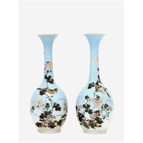 Pair of Old (1910) Japanese Shark Skin Studio Long Neck Vase Signed