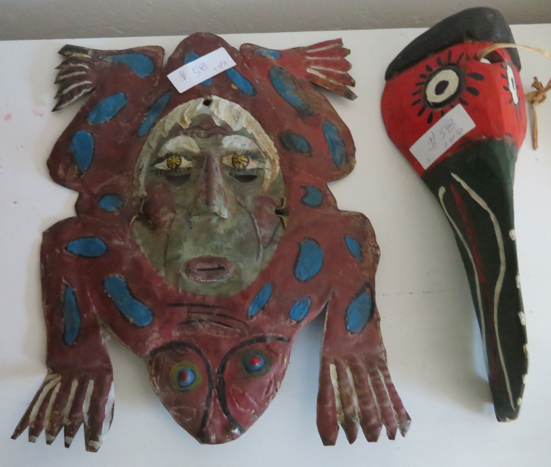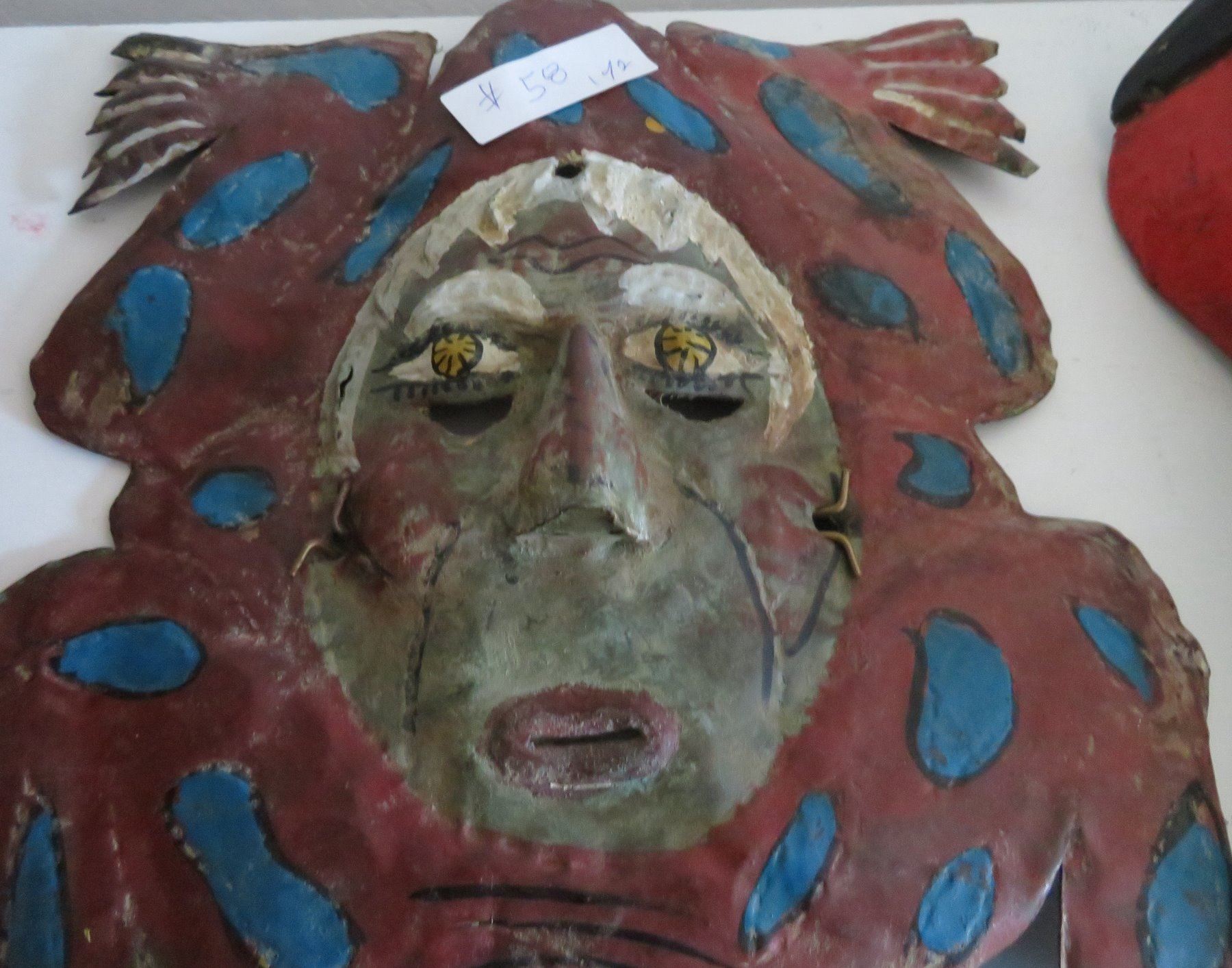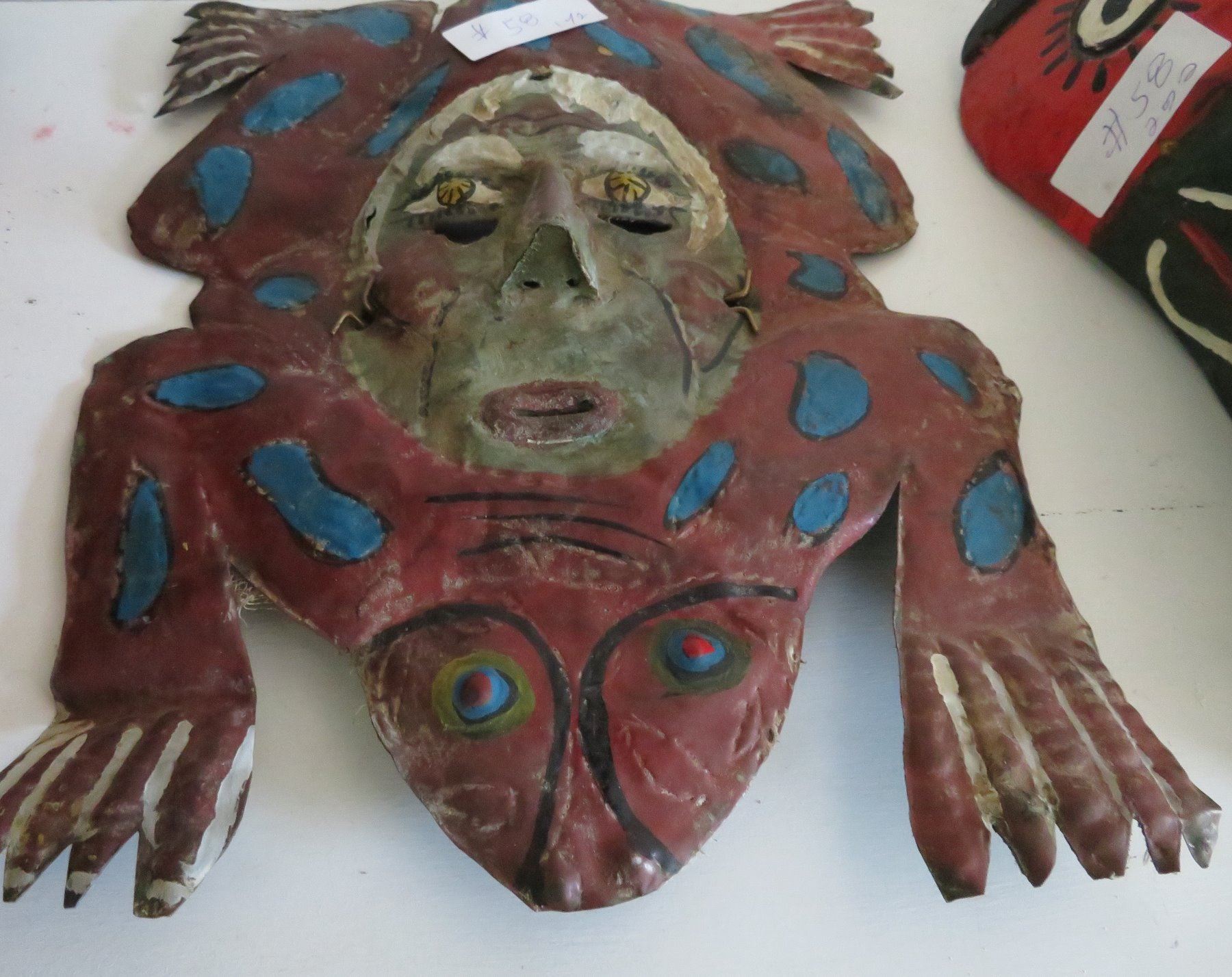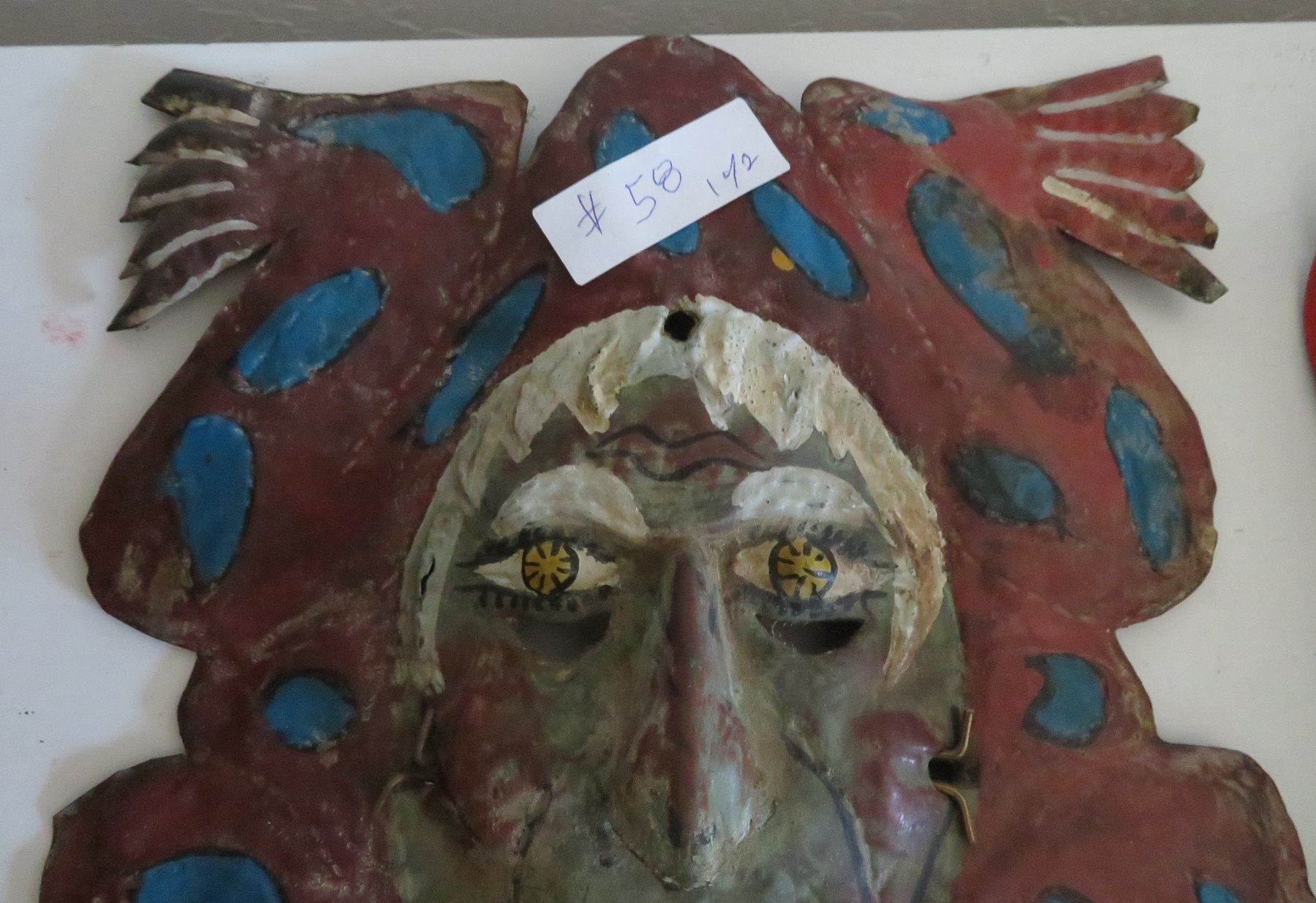 2 Old Mexican Masks, c. 1930s. Made of copper and wood, the large copper mask measures 15" x 12" and the wood mask is 14" x 6". Southern Mexico. Condition: As found, see images. Shipping: $40.00 w/insurance and signature, due to size.