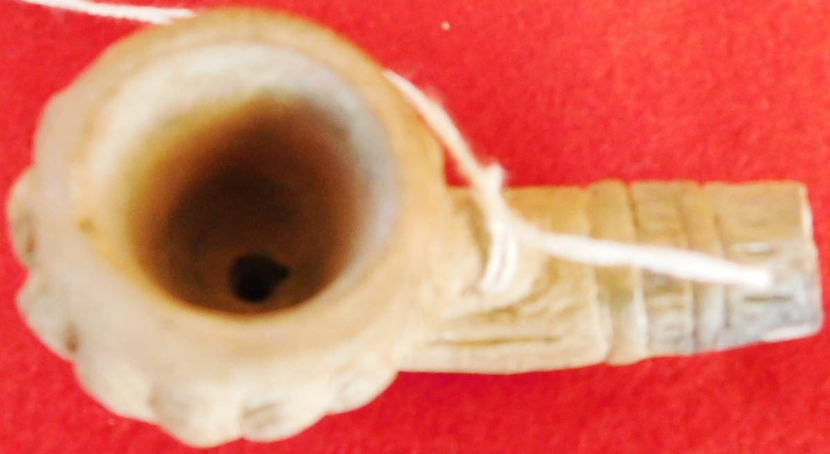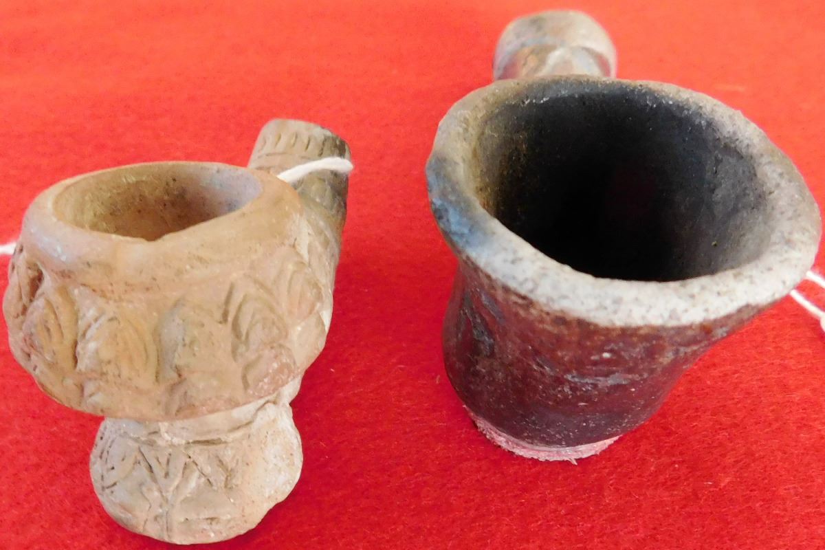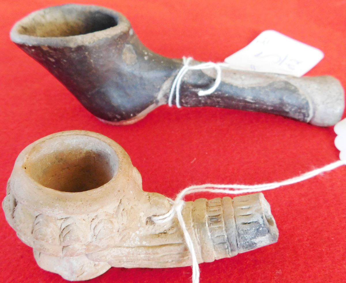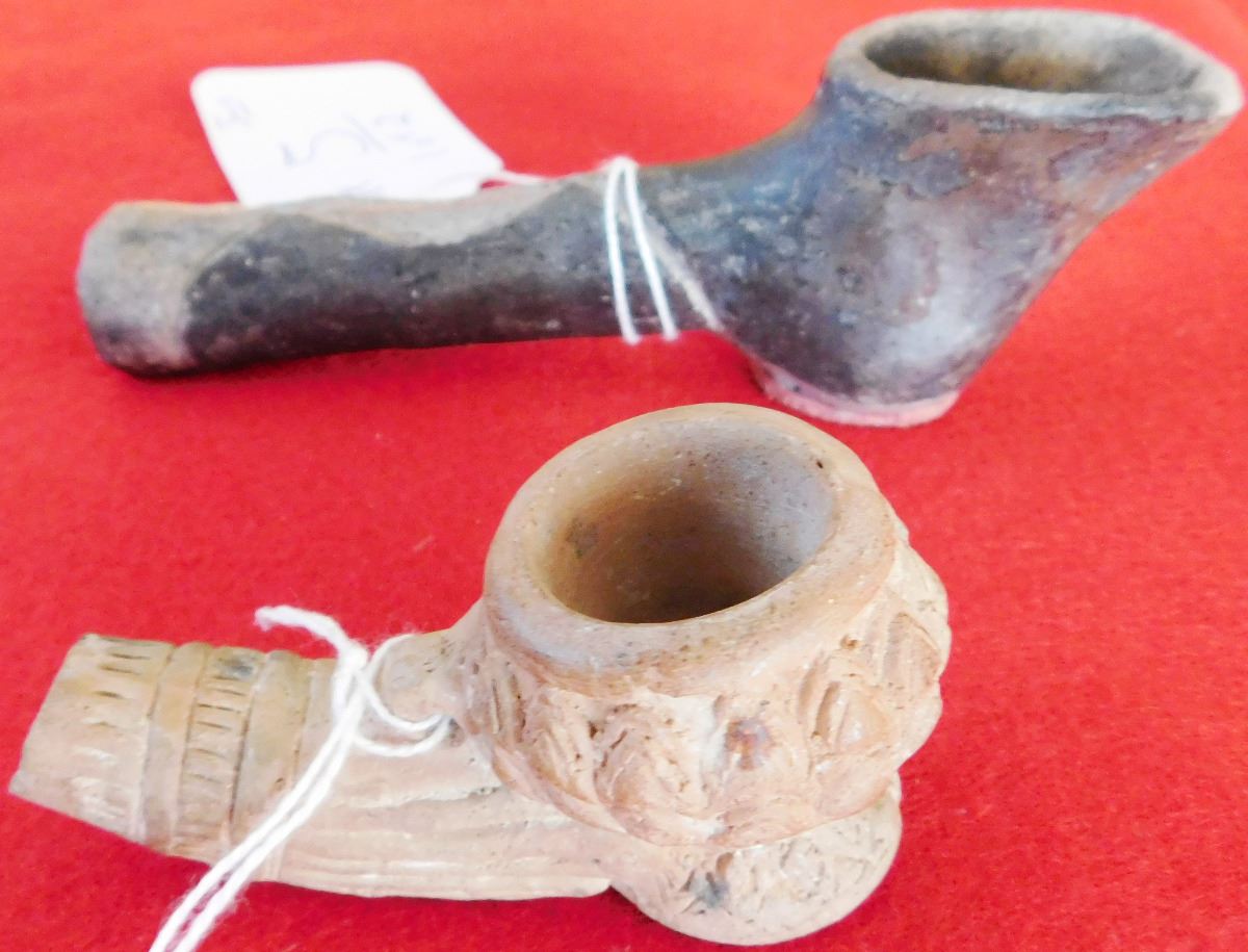 2 Old Native American Clay Pipes. Both pipes are from the 1700s and made of clay. The larger pipe is from the Columbia River, measuring 1.5" x 3". The other larger pipe is from the Northwest Coast, measuring 6" x 2". Columbia River and Thompson River area. Condition: Columbia river pipe has a portion of stem broken, NWC pipe has some scratches and felt on bottom of bowl, see images. Shipping: $16.