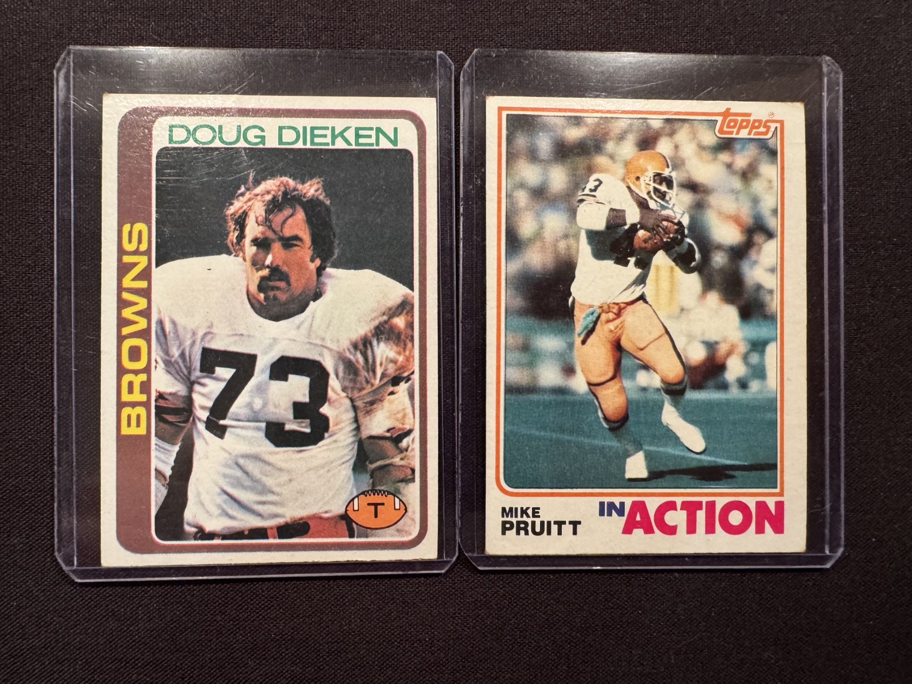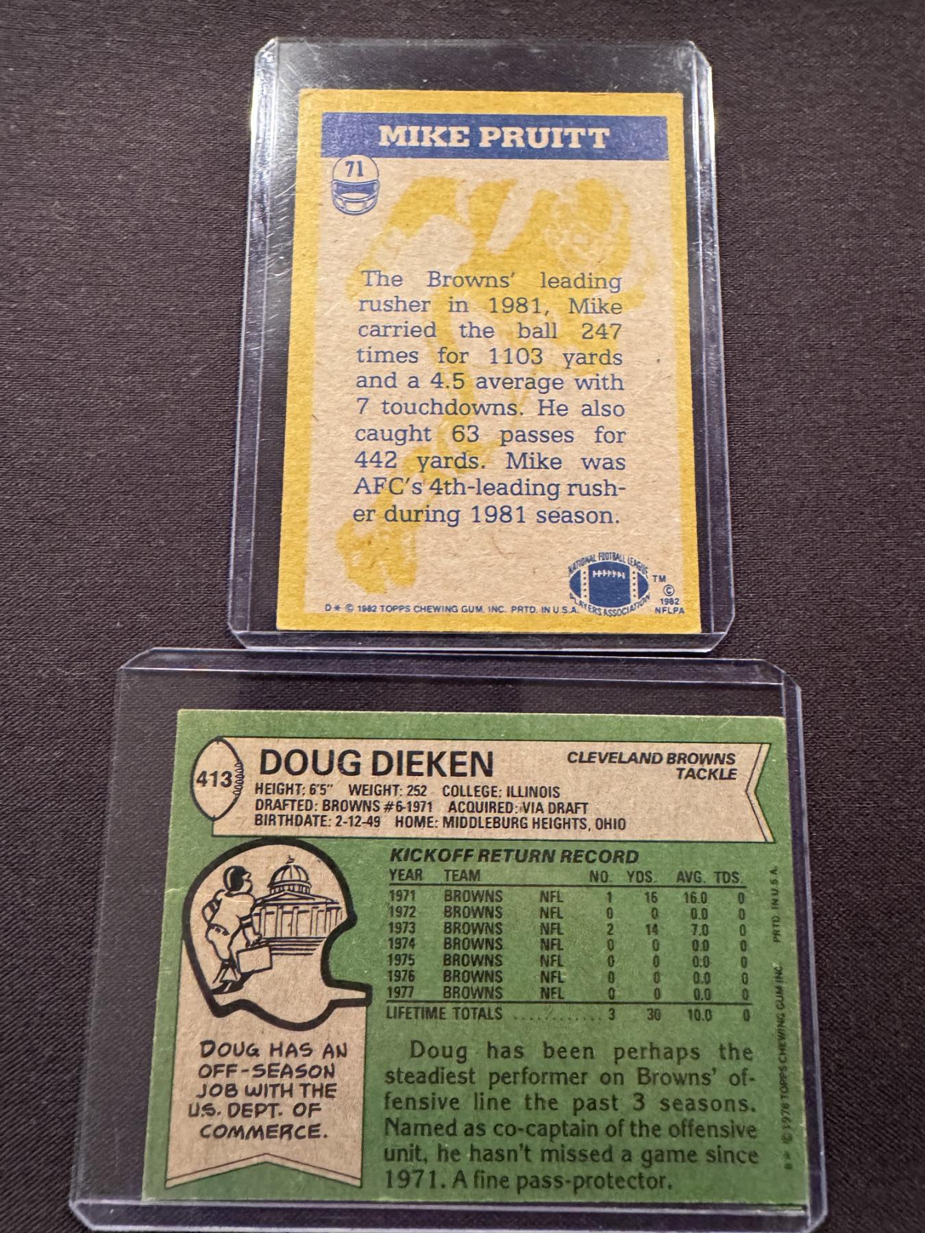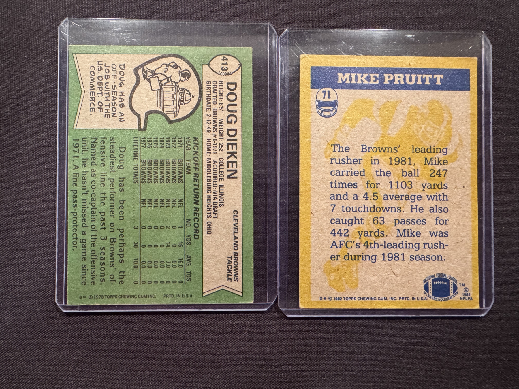 2 - Old Topps Cleveland Browns Football Cards - Doug Dieken & Mike Pruitt - Mint Condition
