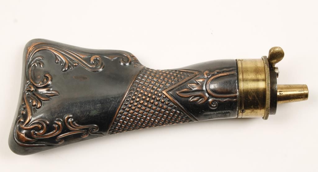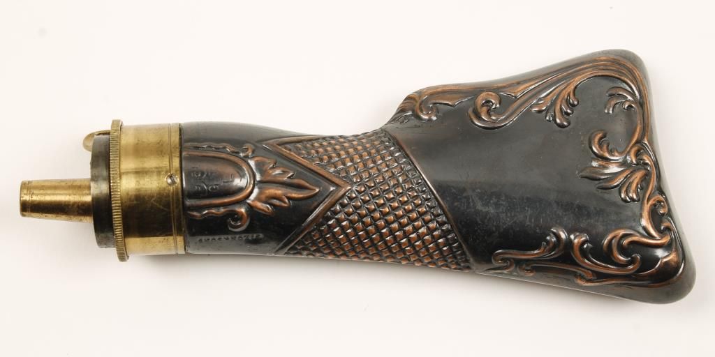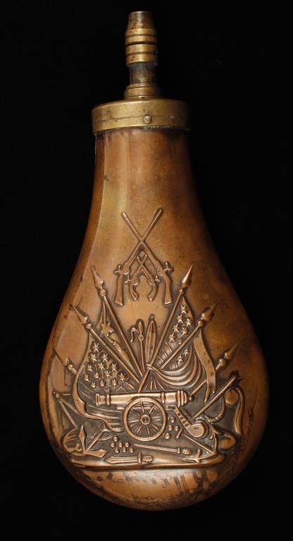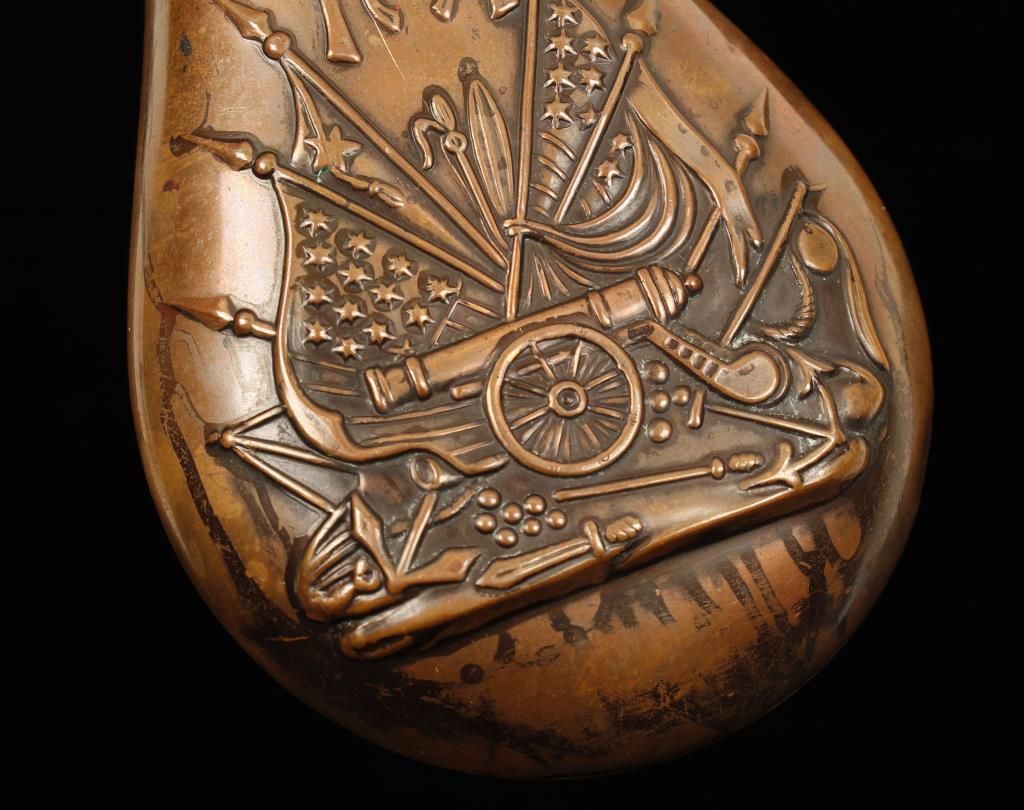 (1) Pocket Model. Measures 2 1/8" tall by 5 1/8" long. This is in the shape of a rifle butt stock. Copper and brass construction. (1) Military Motif. Measures 3 1/4" wide by 7 1/8" tall. Copper and brass construction. Offered "as is", we don't guarantee the authenticity of this item, please do your research. All sales are final.