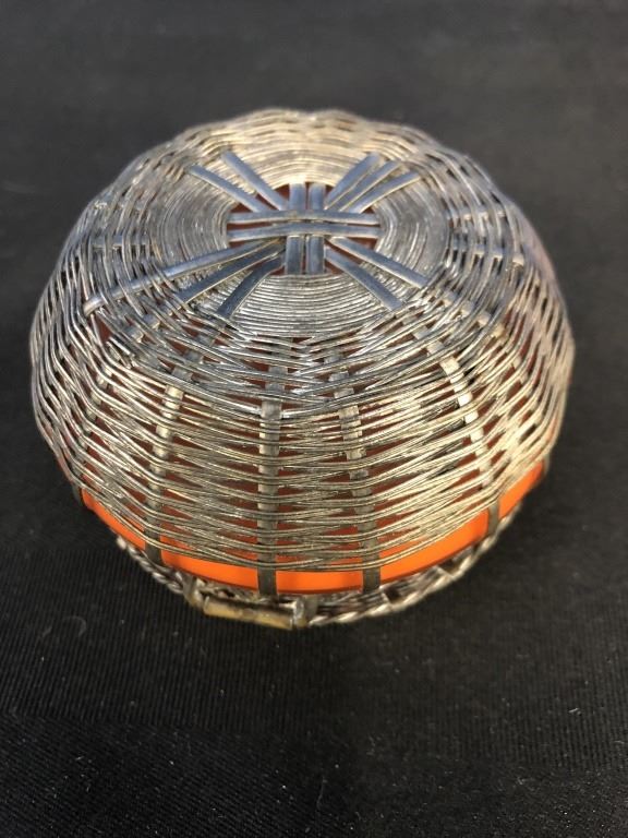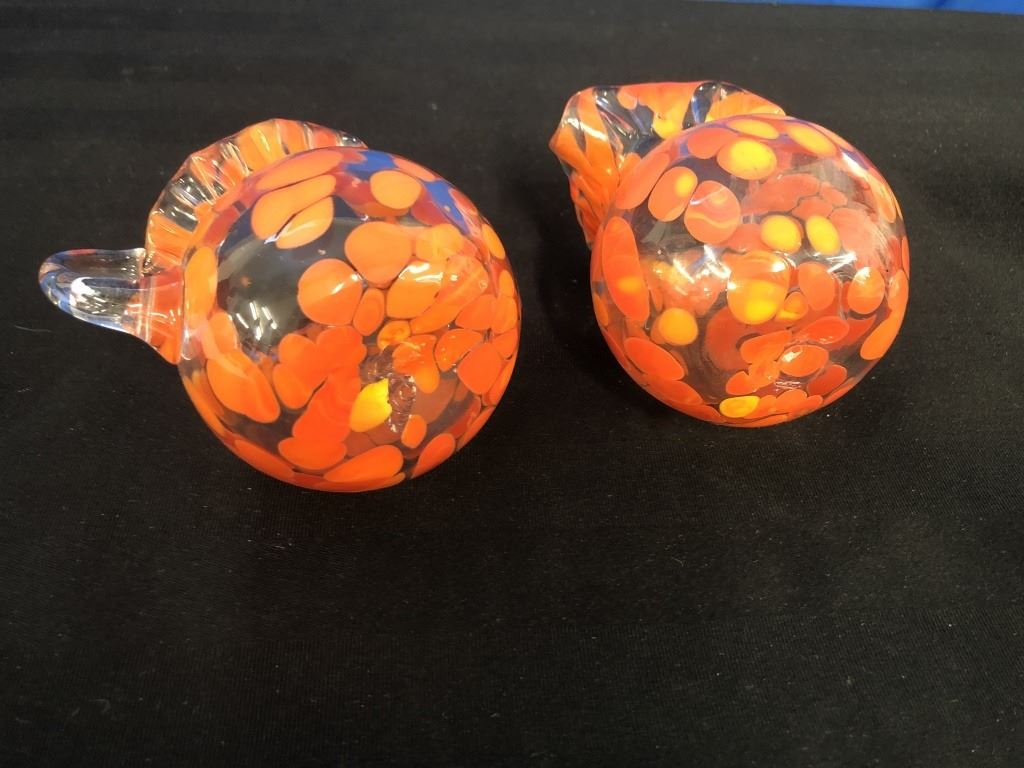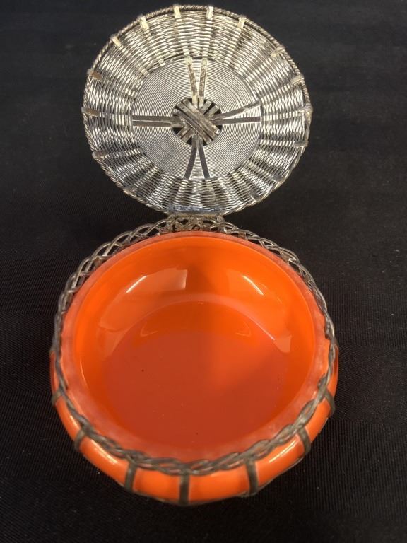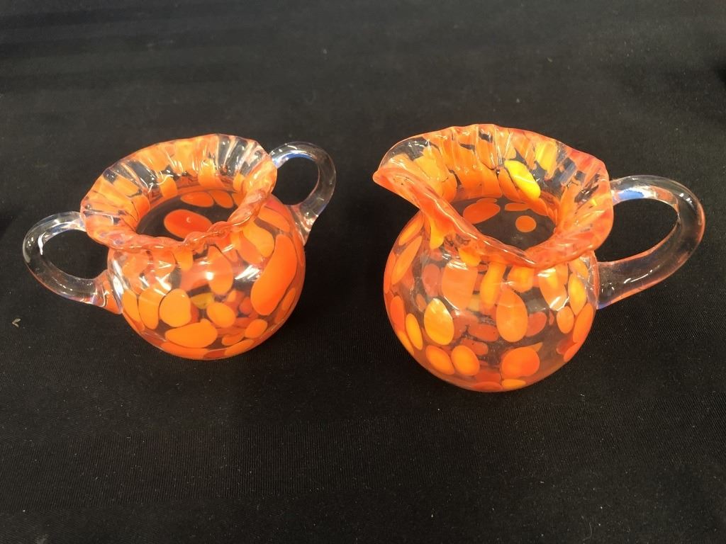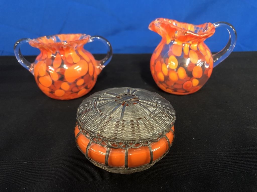 These are so pretty and are approximately 3 inch for sugar handles glass & 4 inch for matching creamer. Included is a orange Bowl with wire work on top lid and bottom basket. Approximately 2 x 3.5?inch. Preowned and all in good condition with no damage noted