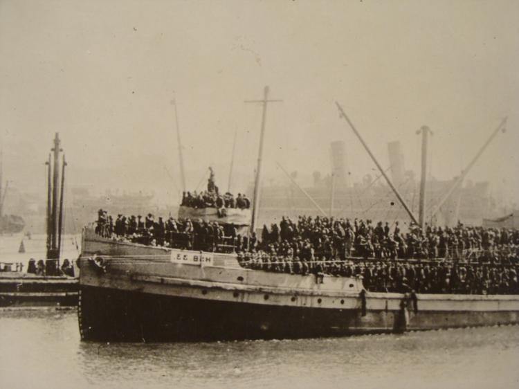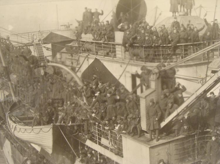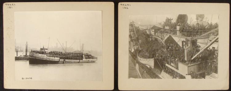 These two original antique photographs show U.S. troops returning home after the end of WWI. The ship is the Mauretania, which was a British ocean liner on the Cunard line, but it was also used as troop transport by both British and American forces. One has a label on back that describes the scene, as troops are "cheering and singing." Each photo has a cardboard backing, and their image size is 5 1/4 x 7 1/2 inches. One has a small portion cut out, possibly by a soldier. The backing one one has some spotting in the border, and one has a bent corner. Overall both photos are crisp and clean and in excellent condition. They are numbered from a catalog, probably from a museum or library collection. * It is great to see both the entire ship, and the excitement of the troops, as they scurry onto the decks, and into the lifeboat on their triumphant return home.