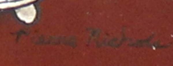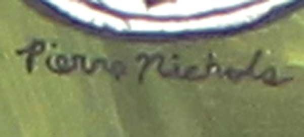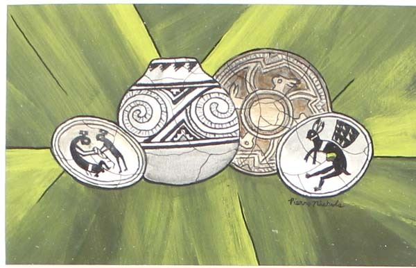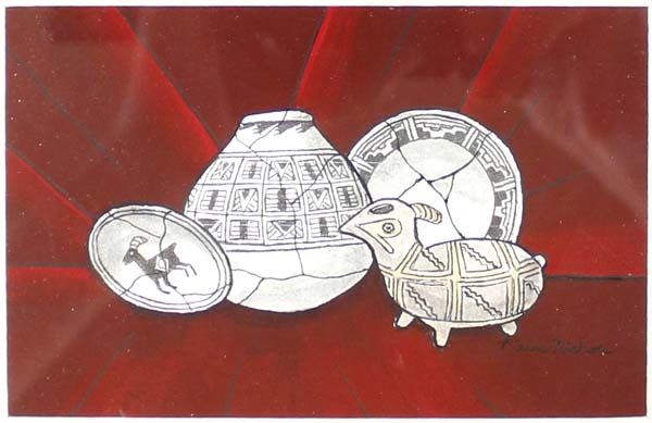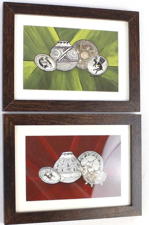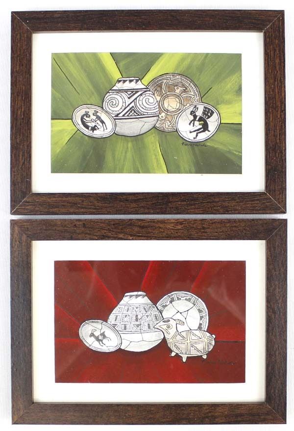 2 Original Mimbres Designed Acrylic & Ink Paintings by Pierre Nichols, visual measures 3.5'' x 5.5'' and is signed by the artist, overall framed measurement of 5.75'' x 8'', matted and under glass FYI: ''Pierre Nichols, is a Silver City, multi-media artist best known for his years of making reproductions of Mimbres pottery using gourds. His work is collected by many, as well as by professionals in the field of archeology. Over a dozen of his gourd reproductions are a major part of the permanent display at the Mimbres Heritage Center Museum, located in the Mimbres Valley, New Mexico. Continuing with his love for the Mimbres culture, he has done beautifully detailed paintings of the Mimbres pottery, as large pieces as well as some very special small miniatures, some of which we have here for the auction. Twelve miniatures, each hand inked and painted. A wonderful collection if you are lucky enough to get them all. Also of interest are his ''nicho'' inspired contemporary devotionals which he has made in beautiful detail, often using inlays of brass, and recycled woods etc. Pierre continues to offer artwork through galleries, arts shows in surrounding states and his website, as both an artist as well as a published author.''