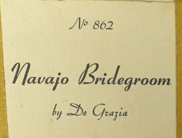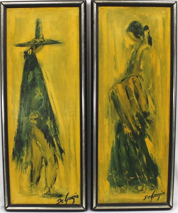 2 Vintage Original Framed De Grazia Paintings on Board, No. 861 Navajo Bride and No. 862 Navajo Groom, normal wear and tear for age, visual measures 8.5'' x 24'', overall measurement 10.25'' x 25.5'', name handwritten in pen on the back of each ''Baron Wm. K. von Noz'', FYI: ''(1909-1982) I want to be notorious rather than famous. Fame has too much responsibility. People forget you are human.'' - Ettore ''Ted'' DeGrazia, The son of Italian immigrants, Ettore DeGrazia was born June 14, 1909, in the Morenci mining camp of Territorial Arizona. DeGrazia-nicknamed Ted by a schoolteacher-graduated from Morenci High School when he was 23 years old.''