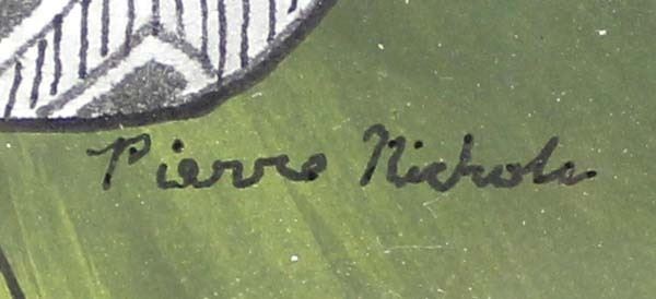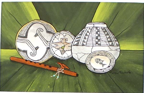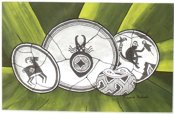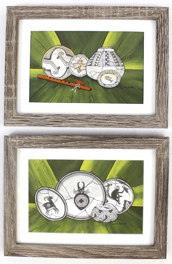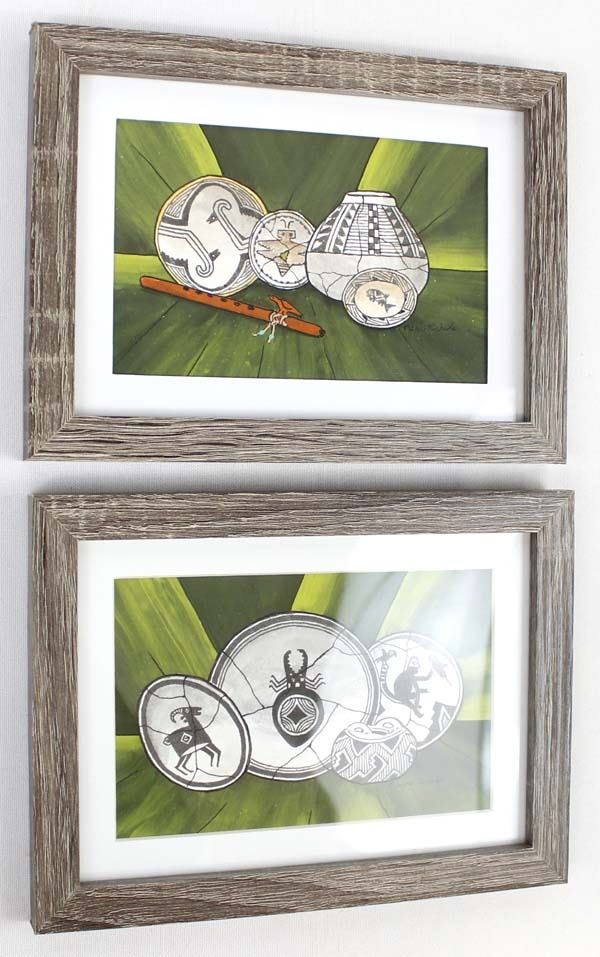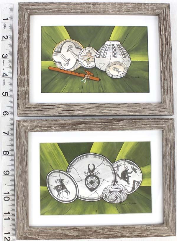 2 Original Mimbres Designed Acrylic & Ink Paintings by Pierre Nichols, visual measures 3.5'' x 5.5'' and is signed by the artist, overall framed measurement of 5.75'' x 8'', matted and under glass FYI: ''Pierre Nichols, is a Silver City, multi-media artist best known for his years of making reproductions of Mimbres pottery using gourds. His work is collected by many, as well as by professionals in the field of archeology. Over a dozen of his gourd reproductions are a major part of the permanent display at the Mimbres Heritage Center Museum, located in the Mimbres Valley, New Mexico. Continuing with his love for the Mimbres culture, he has done beautifully detailed paintings of the Mimbres pottery, as large pieces as well as some very special small miniatures, some of which we have here for the auction. Twelve miniatures, each hand inked and painted. A wonderful collection if you are lucky enough to get them all. Also of interest are his ''nicho'' inspired contemporary devotionals which he has made in beautiful detail, often using inlays of brass, and recycled woods etc. Pierre continues to offer artwork through galleries, arts shows in surrounding states and his website, as both an artist as well as a published author.''