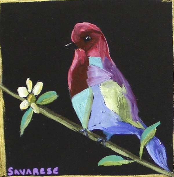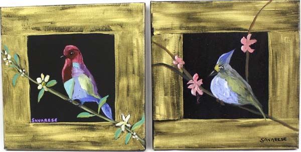 2 Original Oil Paintings by Savarese, bird subjects, very unique painted frame incorporated into paintings, signed by the artist and measure 10''square, beautiful colors
